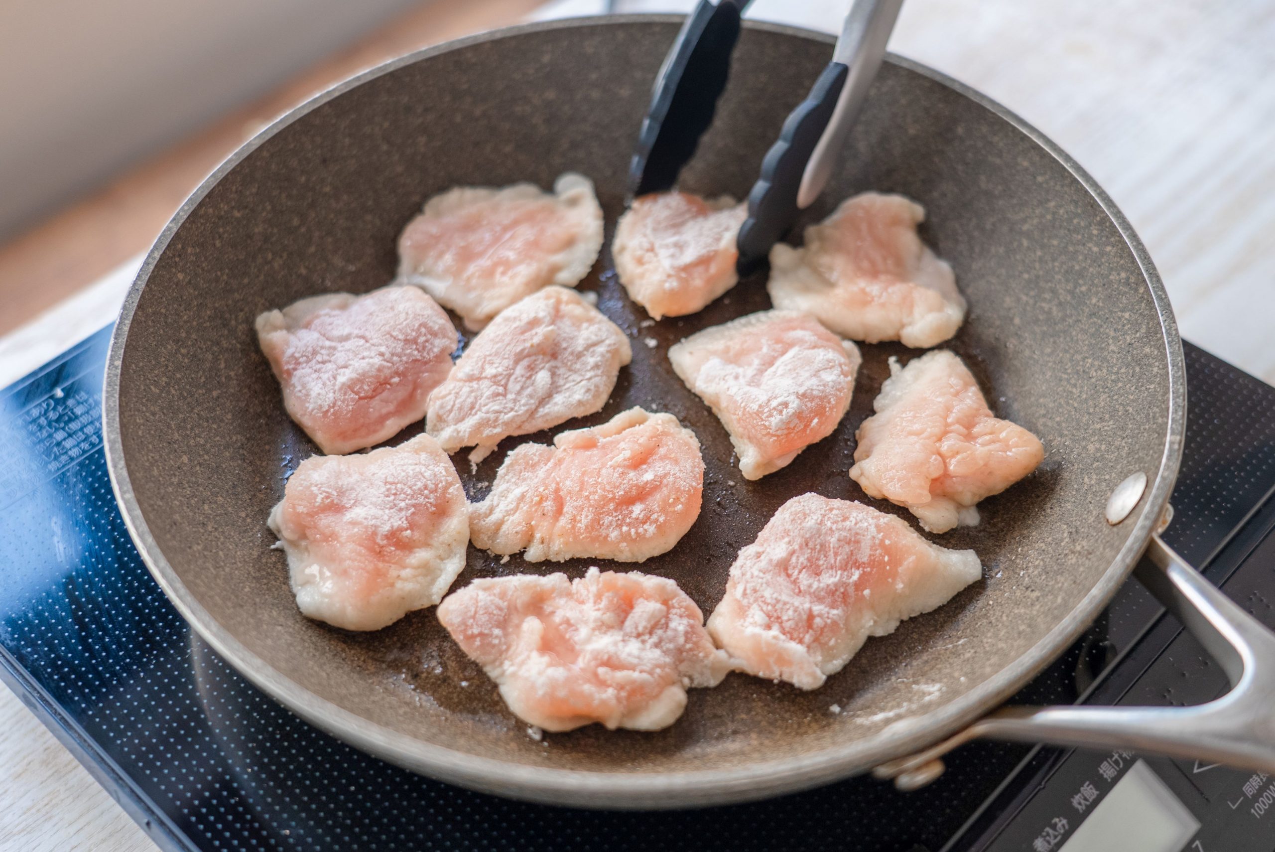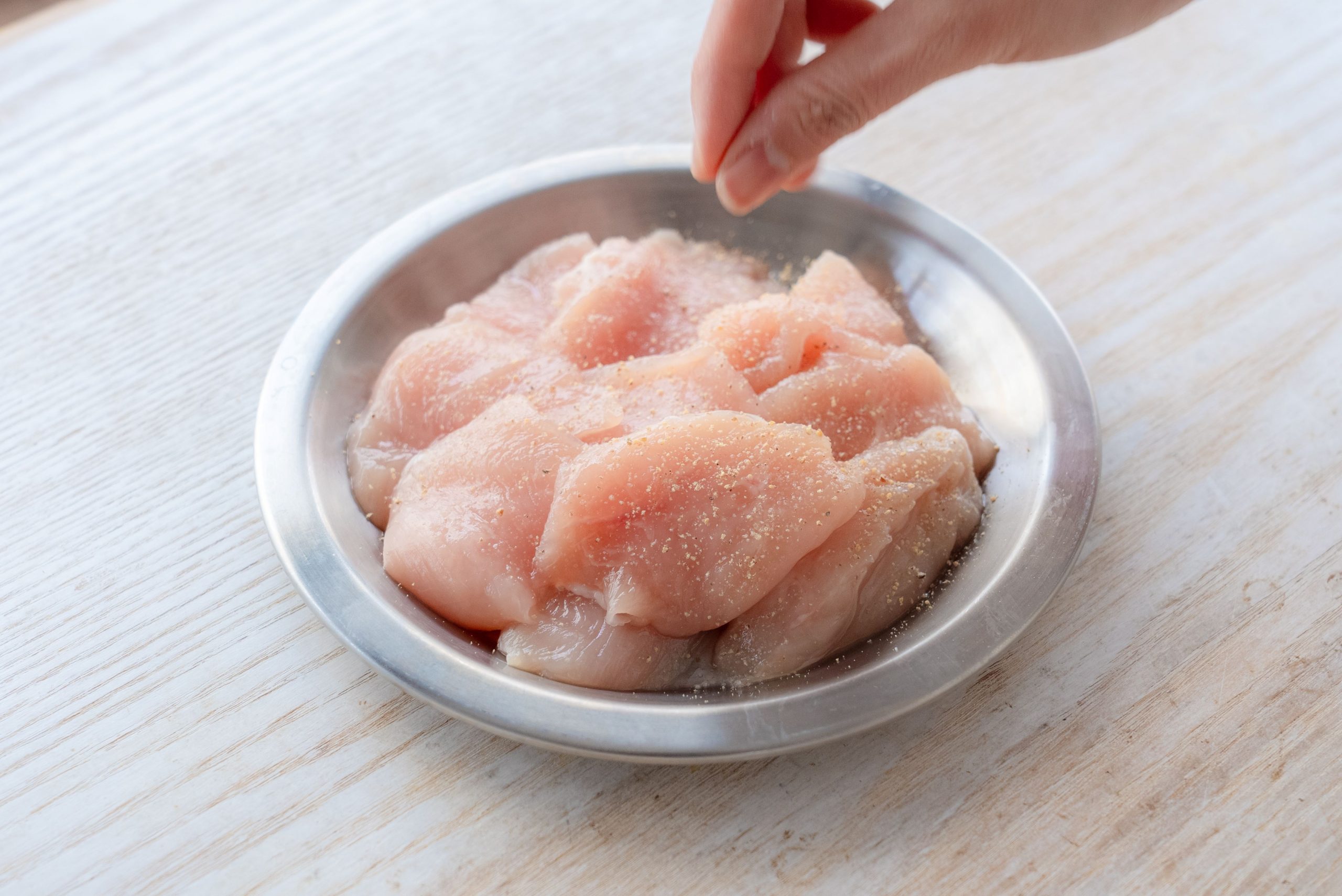 ①鶏むね肉は皮を取り、一口大のそぎ切りにする。塩・こしょうを振る。