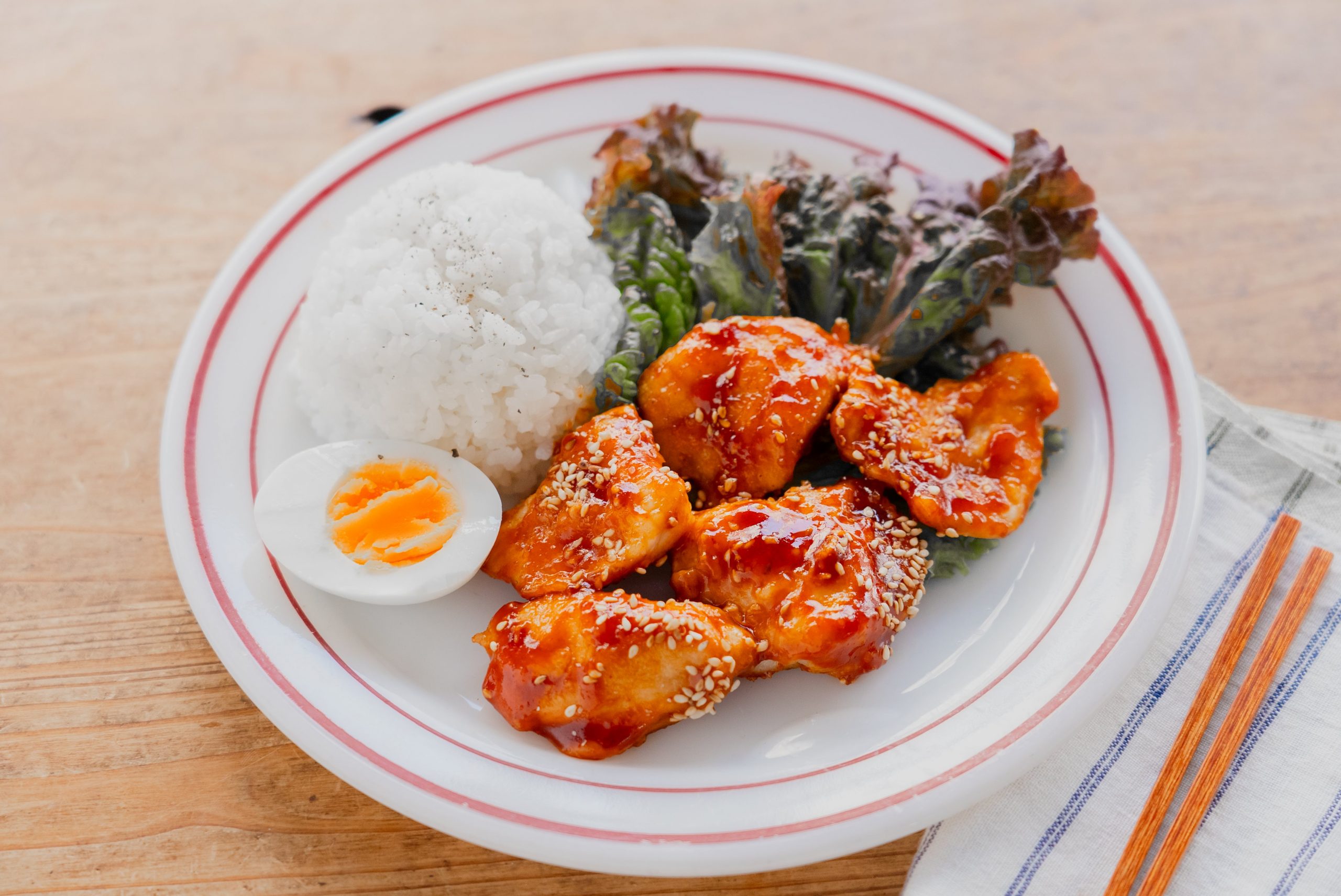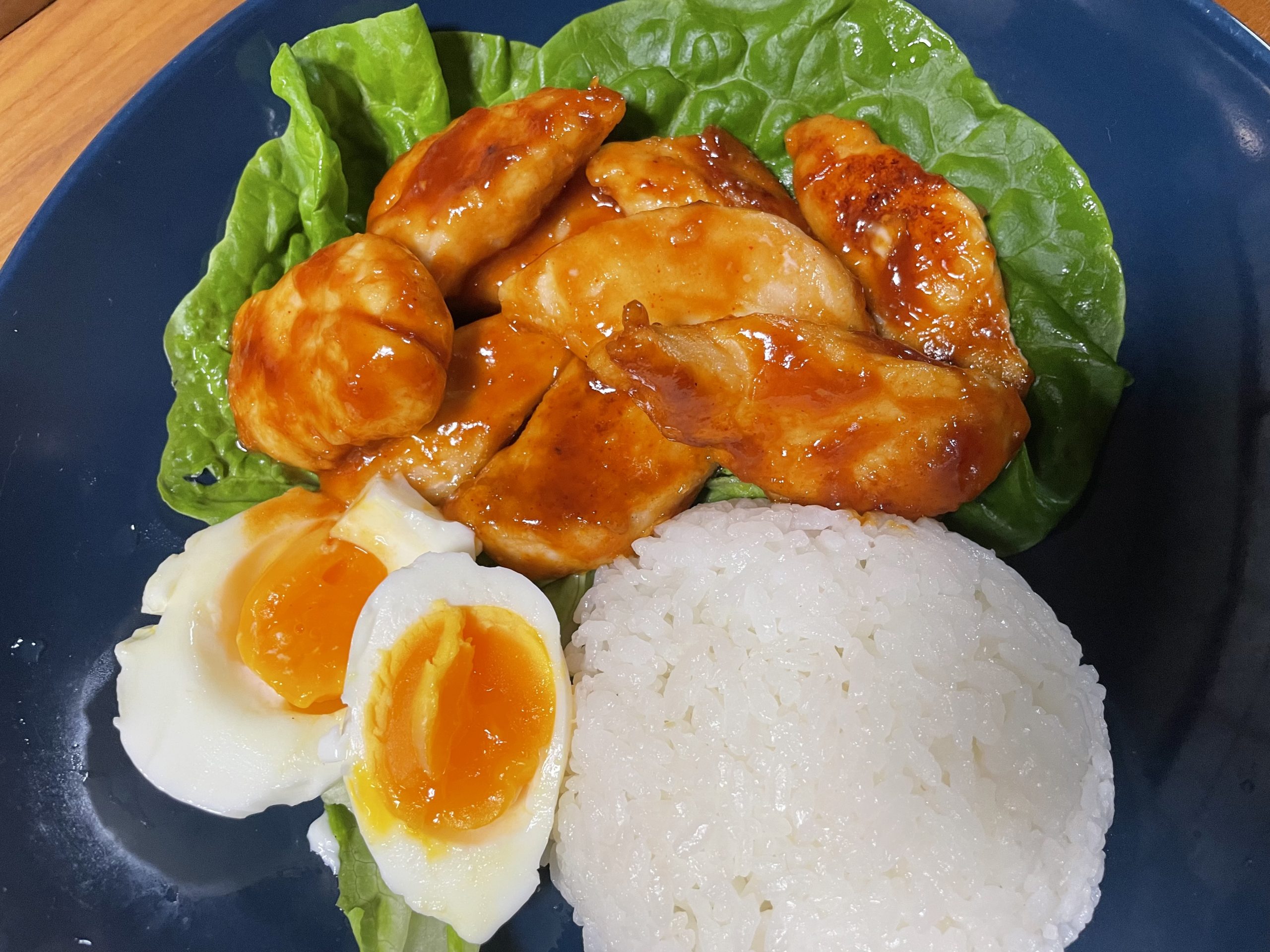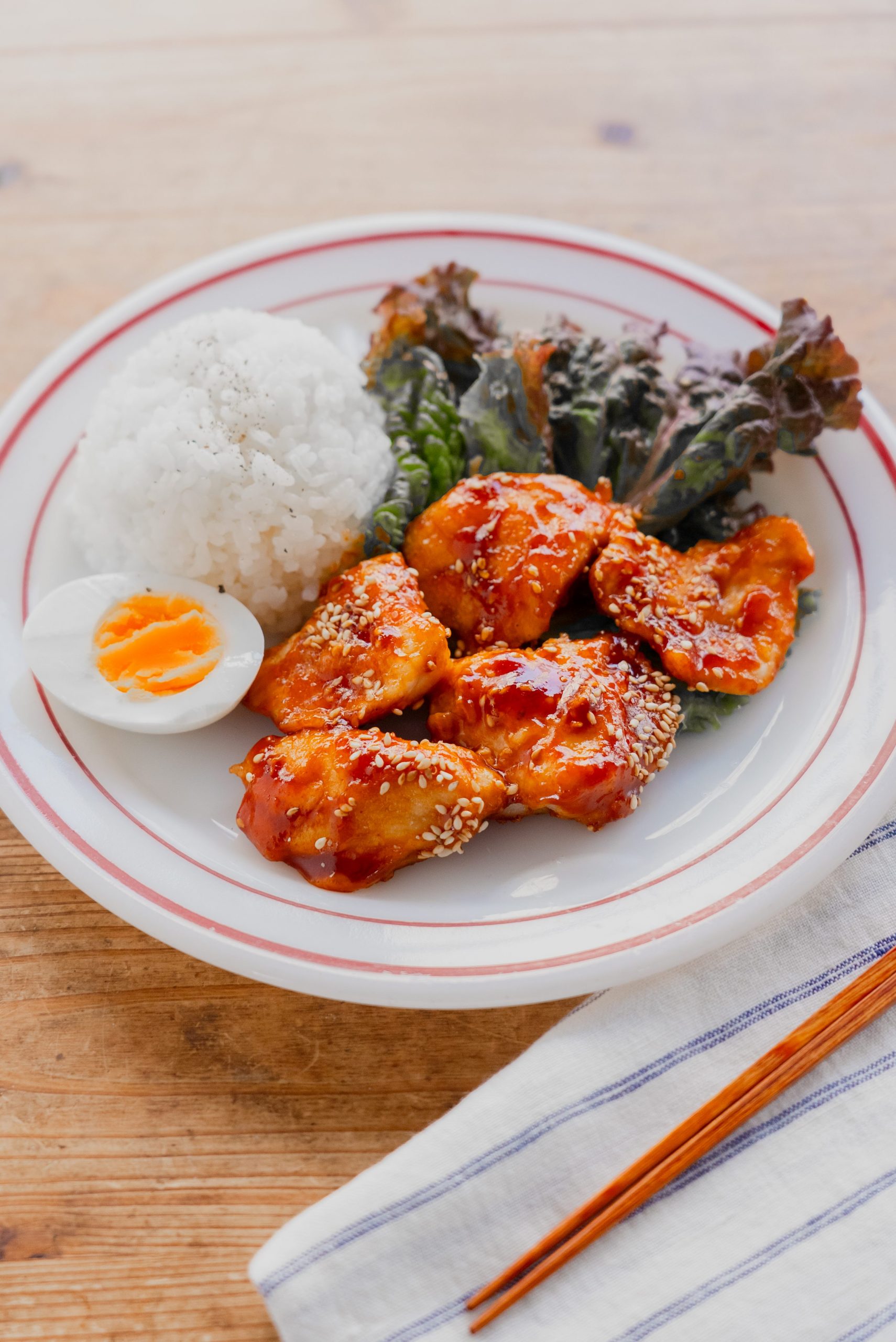 メインは鶏むね肉を使ったヤンニョムチキン。鶏むねは皮をのぞいてカロリーオフ。焼いて味付けし、ご飯と添え野菜、ゆで卵をのせたらワンプレートの完成です! 甘み付けにはラカントを使用し、夜遅い日でも罪悪感なく食べられるように。今回は使用していませんが、白米を「へるしごはん」に代えるとさらにヘルシーに食べられますよ。