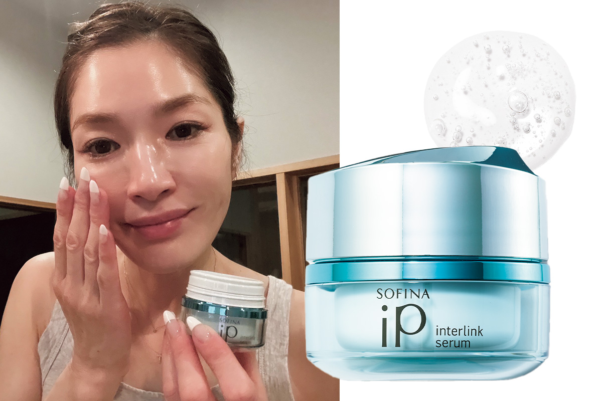 「仕上げはうるおいをぎゅっと閉じ込めるクリーム。乾燥しやすい頰の開き毛穴が午後も目立たないのを実感」ソフィーナiP インターリンク セラム55g ¥4,180〈編集部調べ〉(花王)