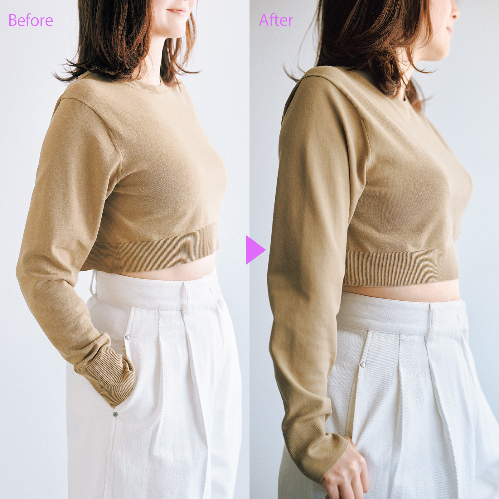 BEFOREのブラトップだと、胸がお腹に近い位置まで下がり、同化してしまうので太って見えがち。バスト位置を上げて、お腹とバストを区切ることで、若々しい胸の形に仕上がります。