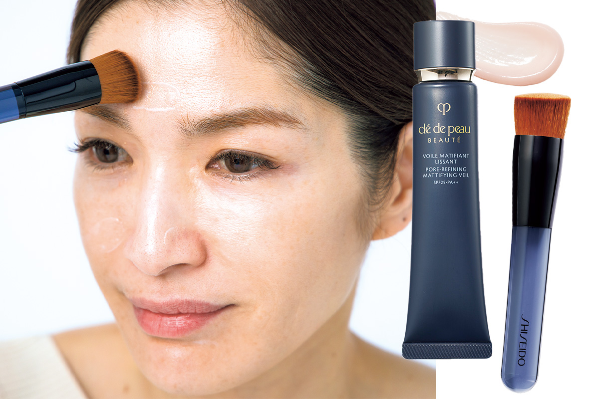ブラシで塗るのが新鮮!点置きした下地をブラシでササッとのばすと、毛穴の凹凸がなくなります。