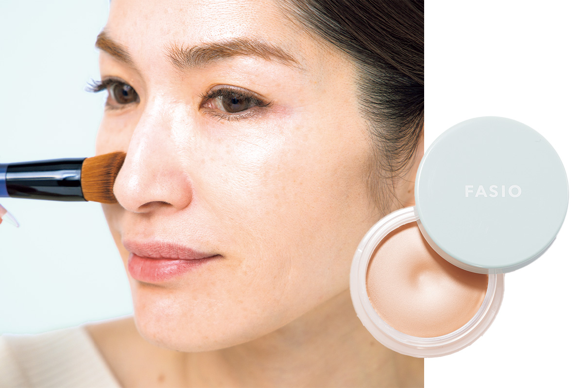 薄く置いたファンデをつなげるようにブラシでのばすと厚塗り感なし。色ムラまで徹底カバー。
