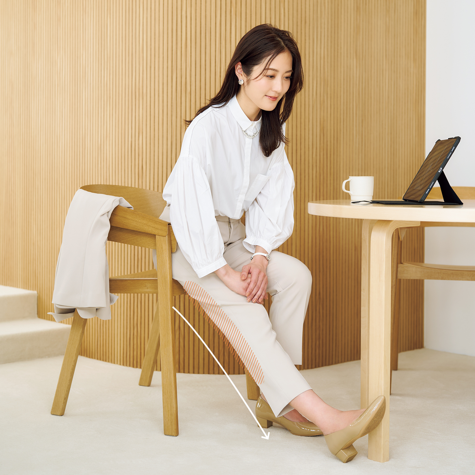 長時間のデスクワークで圧迫されがちな裏ももをストレッチ