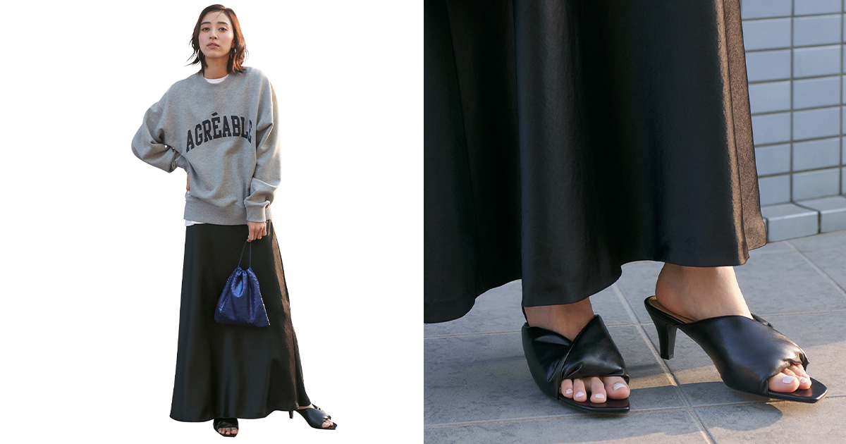 黒ミュール[H6.5cm]¥15,400(アダム エ ロぺ)スカート¥20,900(ル フィル/ルフィル ニュウマン新宿店)ロゴスウェット¥16,500(ザ ポーズ/ウィム ガゼット玉川髙島屋S・C店)タンクトップ¥7,700(アッパーハイツ/ゲストリスト)ピアス¥8,400(アビステ)バッグ¥14,300(マリア ラ ローザ/ロンハーマン)