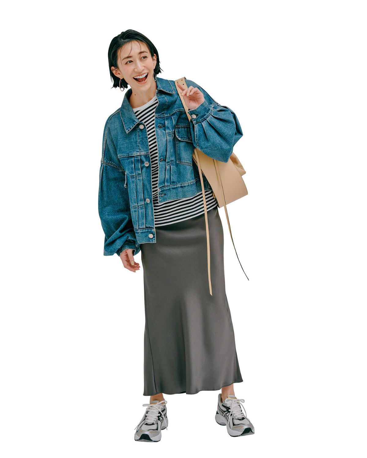 大トレンドのデニムジャケットはスカート合わせがおすすめ。スカートはベイジ、デニムジャケットはハイク、カットソーはルミノア、スニーカーはアシックス、バッグはラディカ スタジオのもの。