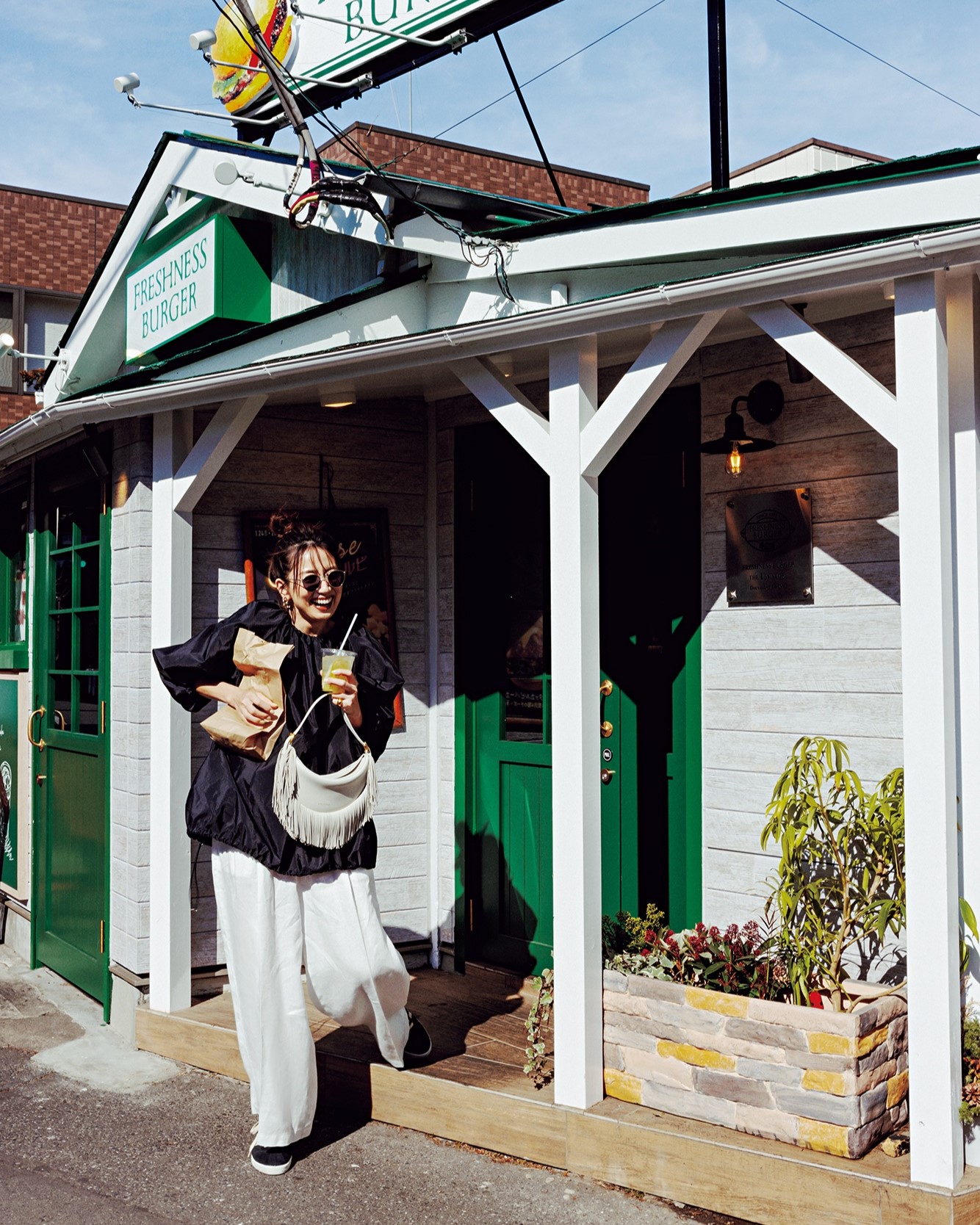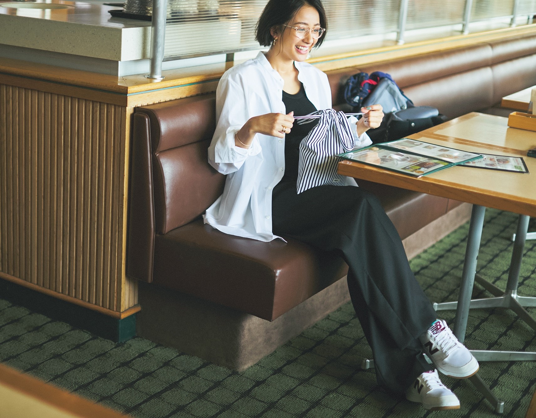 上下ゆるくても、バルーンシルエットのトップスで可愛げを。ドローコードでシルエットを調整できるのも魅力的です。ブラウスはユナイテッド アローズ、パンツはエイトン、スニーカーはグラフペーパーのもの。