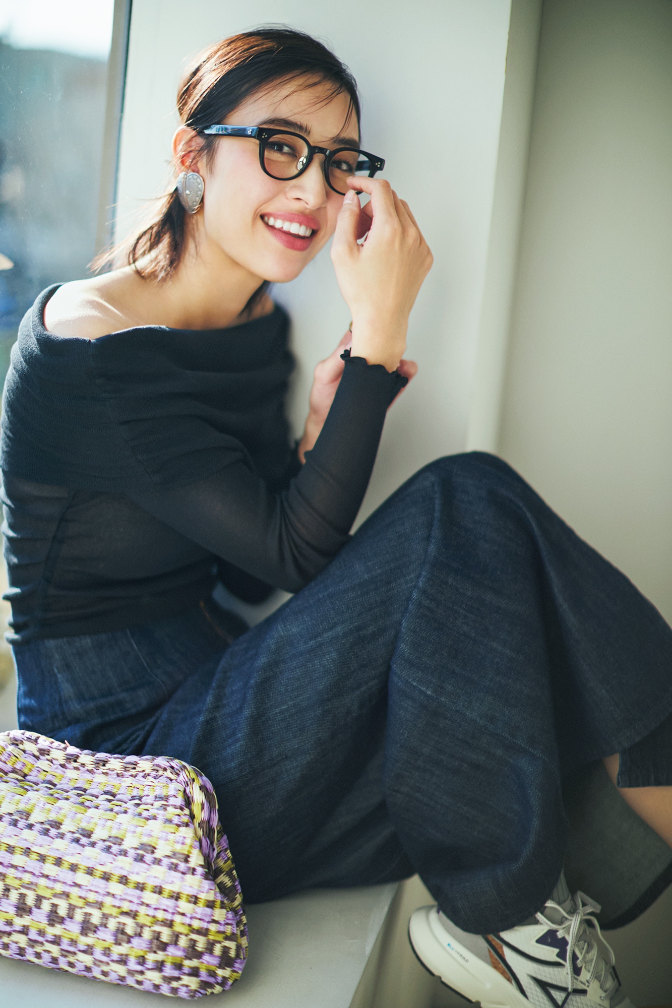 オフショルトップスにはデニムのロングスカートを合わせてヘルシーに。トップスはザラ、スカートはル フィル、スニーカーはディアドラ、バッグはカテリナベルティーニのもの。