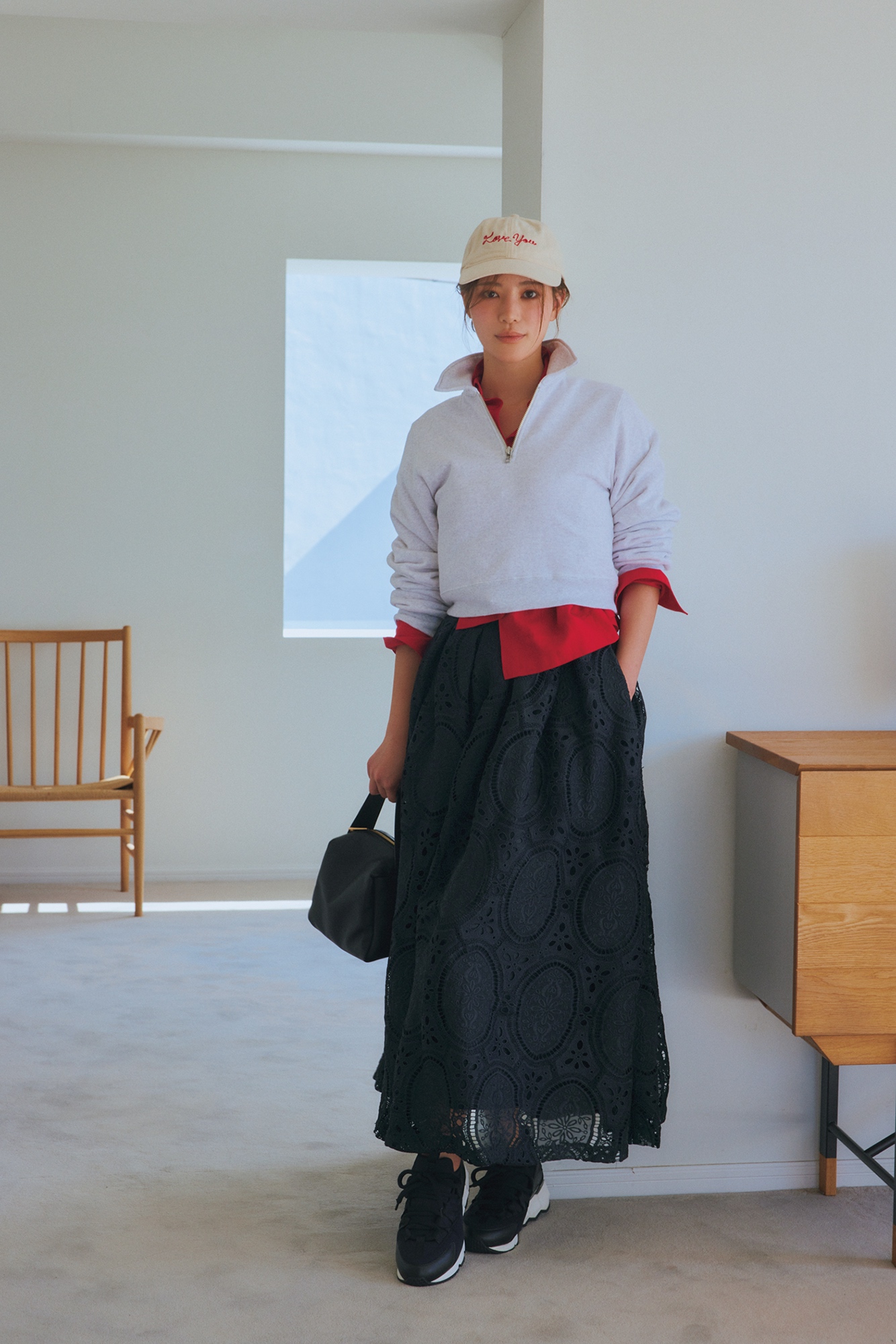 レーススカートにスウェットやキャップを合わせたミックス感が可愛い。ロゴとシャツの赤が効いています。スカートはツル バイ マリコ オイカワ、スウェットはエイチ ビューティ & ユース、シャツはユナイテッドアローズ、バッグはオウレンティ、スニーカーはピエール アルディ、キャップはカーリーンのもの。
