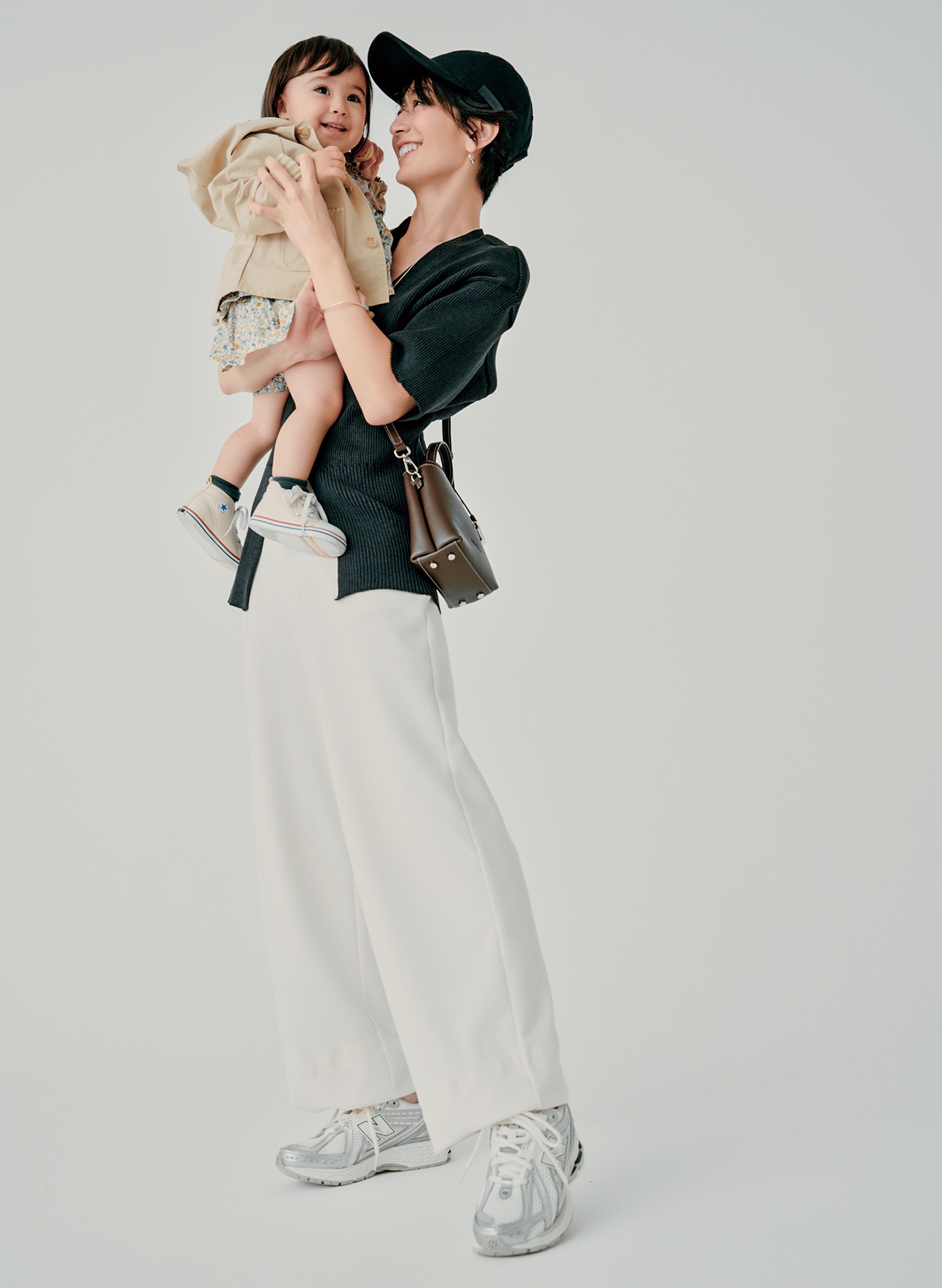 カジュアルに苦手意識のあるキレイめママにはモノトーンのスニーカースタイルを提案。甘めカットソーやシャツを使えば、いつも通りの気分でアウトドア仕様になれます。