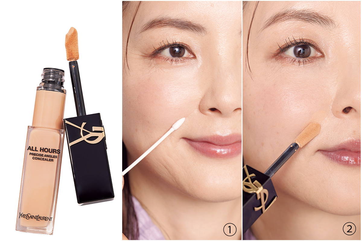 溝に入り込んだベースは、綿棒でオフ。法令線の上から肌より明るめコンシーラーをのせ、なじませて。斜めカットのアプリケーターが筆ペンのように密着。