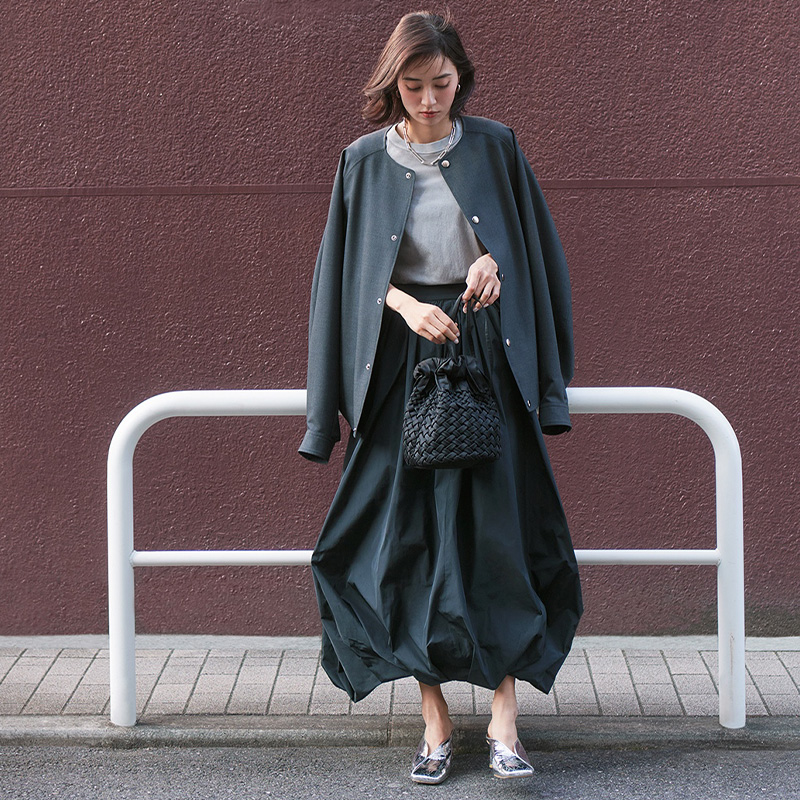 ミュール[H6cm]¥19,800(ル タロン グリーズ/ル タロン グリーズ ルミネ新宿店)バルーンスカート¥113,300(コー/イーストランド)ブルゾン¥59,950(ザ・リラクス)カットソー¥22,000(ATON/エイトン青山)ピアス¥24,200ネックレス¥81,400(ともにブランイリス/ブランイリス トーキョー)バッグ¥83,600(マーレット/リトルリーグ)