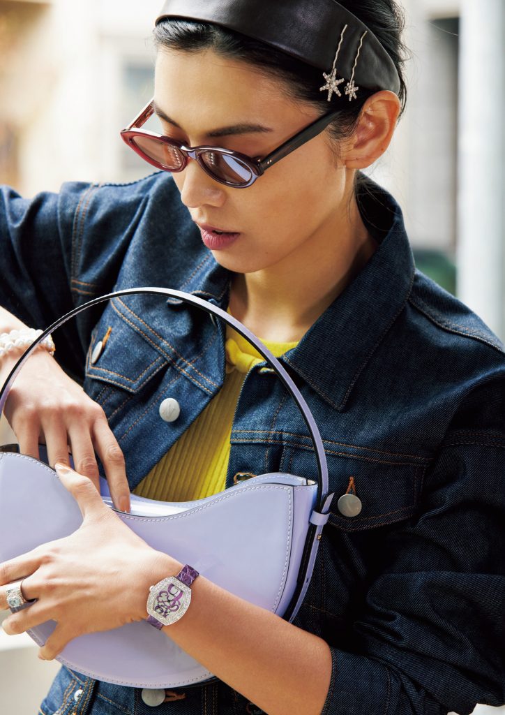 時計「インフィニティ カーベックス ダイヤモンド」[ケース径29×33㎜、18KWG×DIA、クロコダイルストラップ、クォーツ]¥6,930,000(フランク ミュラー/フランク ミュラー ウォッチランド東京)ジャケット¥48,400 パンツ¥37,400(ともにネイル/エストネーショングランフロント大阪店) タンクトップ¥36,300(コズ マニュファクチャード バイ ラッピンノット/ウメダニット)バッグ¥74,800(NOESI/ストラスブルゴ カスタマーセンター)サングラス¥36,300(フェティコ/ザ・ウォールショールーム)カチューシャ¥19,800〈ジェニファーオーレット〉カチューシャについたピン※ 5 本セット¥49,500〈ジェニファーベア〉(ともにザ ヘア バー トウキョウ)ブレスレット¥605,000 リング¥990,000(ともにユタイ/ドーバーストリート マーケット ギンザ)