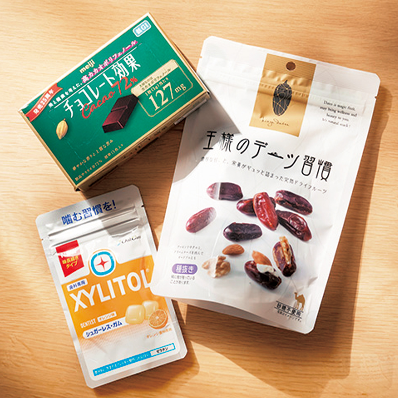 カカオ含有量70%以上のハイカカオチョコレートは糖分抑えめで低カロリー、抗酸化作用がある優秀おやつ。鉄分や葉酸を含むデーツは貧血気味な女子の強い味方です。また、ガムを嚙むと脳内にセロトニンが分泌されてストレス改善に。(工藤先生)