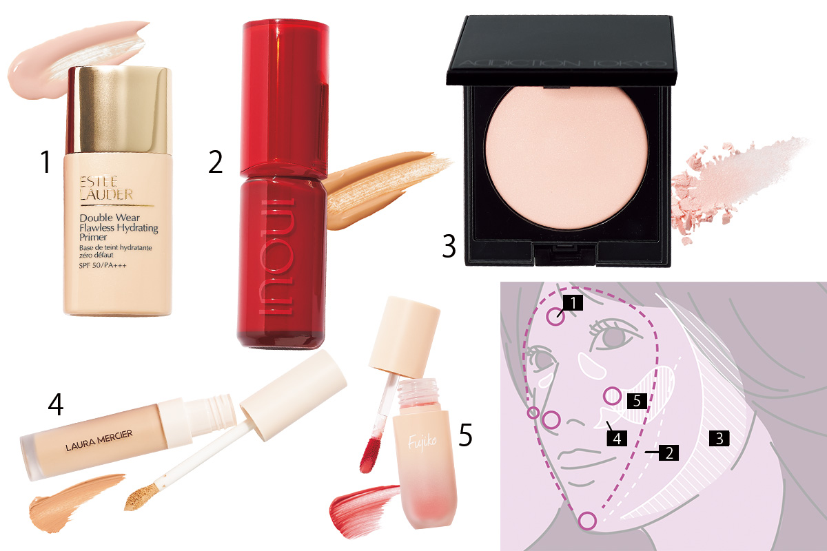 白浮き肌、「走ってきたの?」と思われかねないテカリ、崩れはNG。ピンク下地でトーンアップさせて、ファンデを肌色に揃えてメリハリUP。カバーはコンシーラーで、厚みを最小限に。