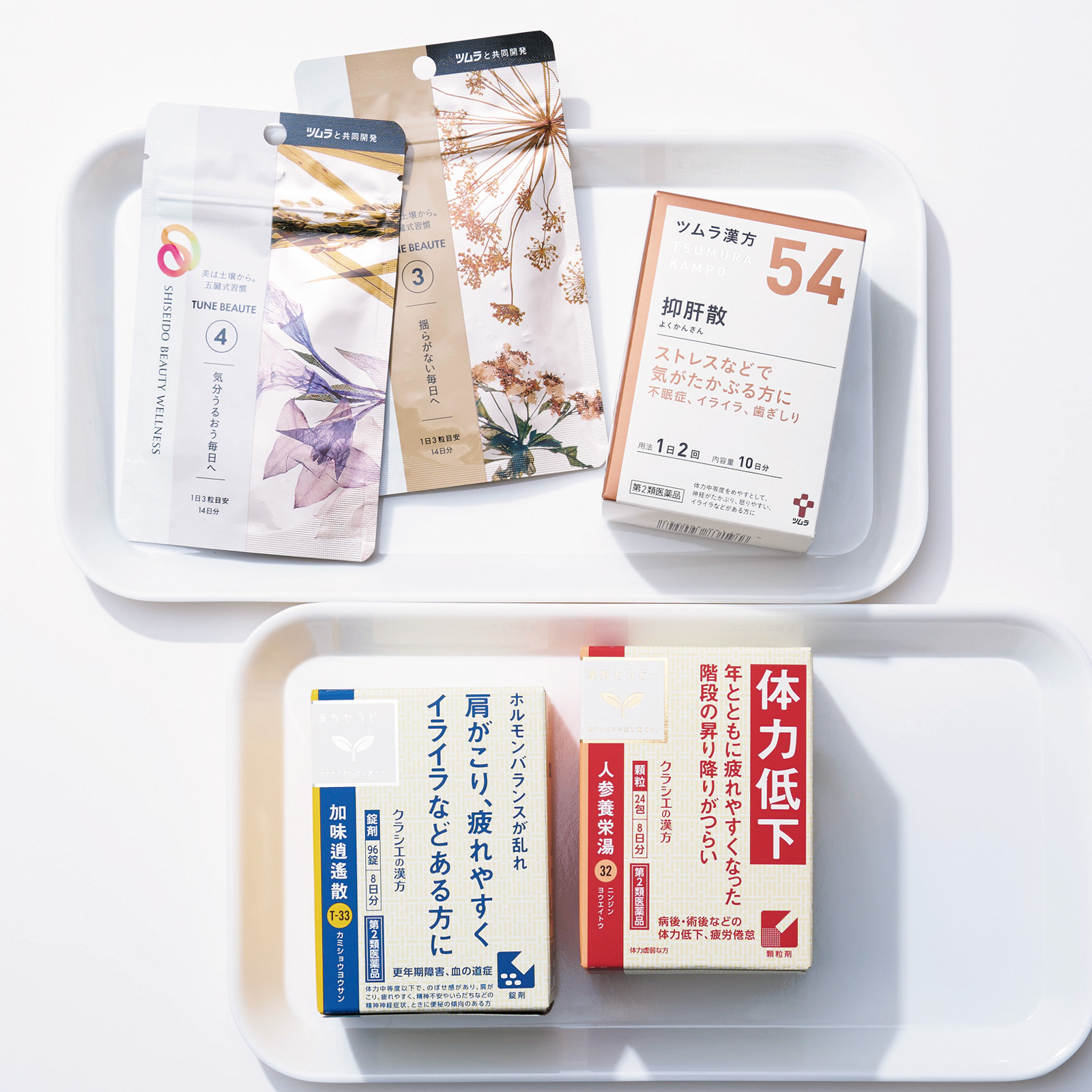 〈上段左から〉チューンボーテ タイプ ホワイト「全身が乾燥しやすい、のどがイガイガする方へ」各42粒(約14日分)、同 イエロー「肌荒れ、胃腸の調子や便秘にお悩みの方へ」各¥3,456(ともに資生堂ビューティーウエルネス)怒りやすい、イライラしやすい人にお勧め。ツムラ漢方抑肝散エキス顆粒[第2類医薬品] 20包(10日分)¥2,640〈編集部調べ〉(ツムラ)