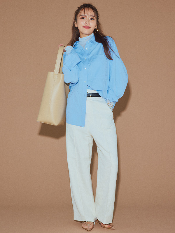 カサカサとしたカジュアル素材で、コンサバになりすぎず今っぽい絶妙バランスに。パンツ¥26,400(マルティニーク/マルティニークルミネ横浜)シャツ¥28,600(ブリル/ブリル新宿)ハイネックトップス¥27,500(キャバン/キャバン丸の内店)ベルト¥23,100(マヌエラ/デ・プレ)ピアス¥48,400(サラース/サラースカスタマーサポート)バッグ¥92,400(フランツロアー/ガリャルダガランテ青山店)シューズ¥39,600(ピッピシック/RHC ロンハーマン)