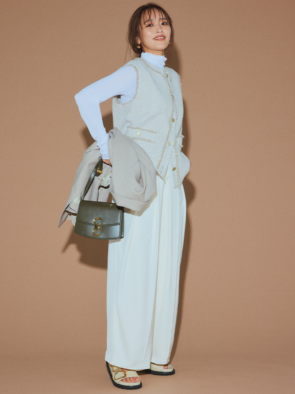 パンツ¥23,100(ミースロエ)ジレ¥72,600(エブール/エブール GINZA SIX店)ハイネックトップス¥19,800(ATON/エイトン青山)手に持ったジャケット¥72,600(ゲミニー/ウィム ガゼット 玉川髙島屋S・C店)ピアス¥44,000〈リエスタジオ〉サンダル¥26,950〈カミナンド〉(ともにトゥモローランド)ショルダーバッグ¥80,740(カフネ/リディア)