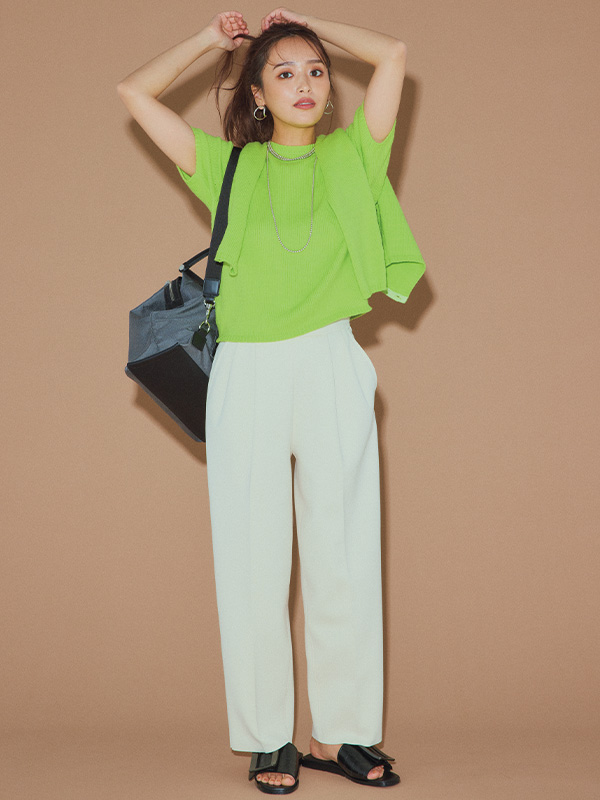 白=手間が掛かるの概念を覆す、ママに優しい名品。パンツ¥28,600(フィーニー)半袖ニット¥19,800肩掛けしたカーディガン¥24,200(ともにボールジィ/トゥモローランド)ピアス¥26,400(ブランイリス/ブランイリス トーキョー)三重にしたネックレス¥46,200(インディアンジュエリー/ロンハーマン)バッグ¥66,000(イアクッチ/イアクッチ 大丸東京店)サンダル¥107,800(BOYY/エム)