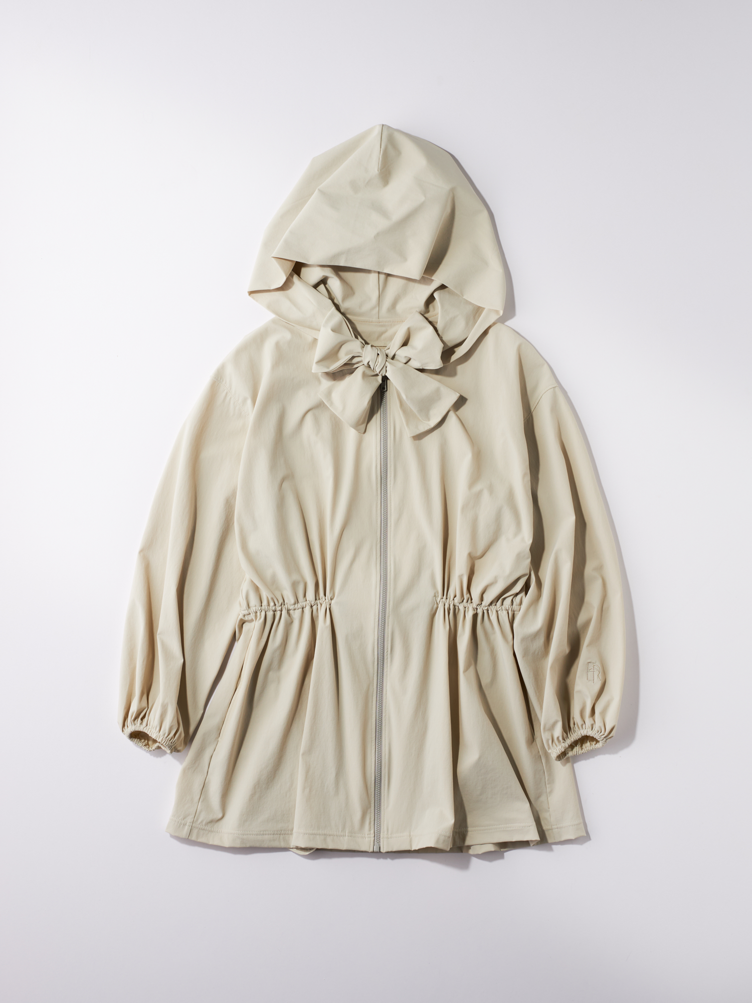 UVカットと撥水効果のあるナイロン素材を使用したラッシュガードのパーカ。袖のゴムギャザー、フードのリボンなど、向かい風にあおられても脱げにくい構造になっており、自転車ママにもおすすめ。裾は生地多めのひらっと仕様で、ウエストを絞るとメリハリが出てスタイルアップにもなります。パーカ¥34,100(ETRÉ TOKYO)