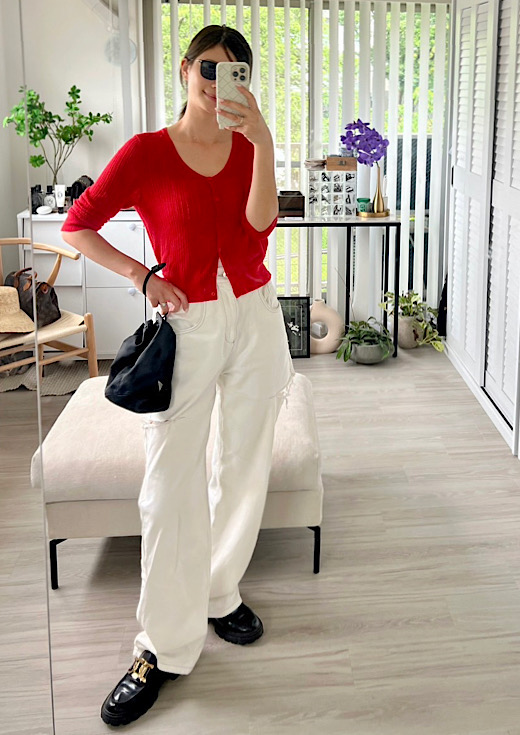 CARDIGAN/UNIQLO : C DENIM PANTS/MAISON MARGIELA BAG/PRADA LOAFERS/Tod’s