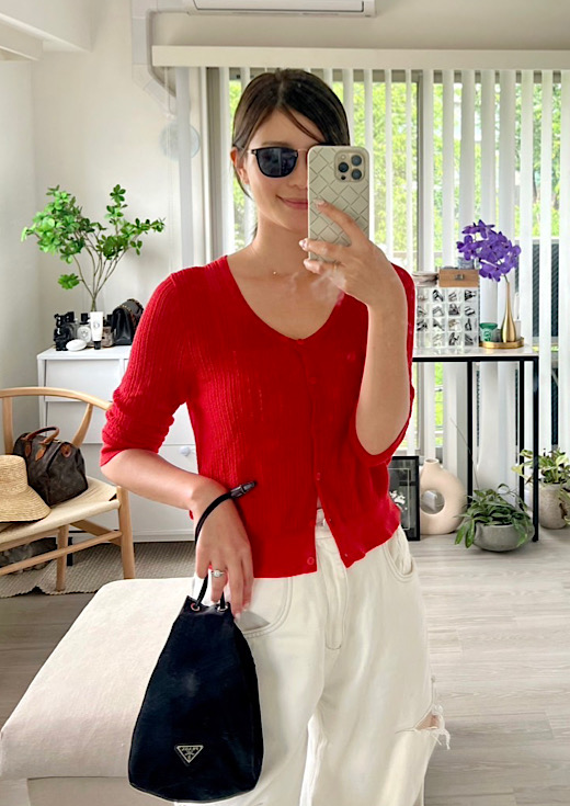 「普段は着回せるモノトーンばかり選ぶのですが、珍しく色ものに一目惚れ。朱色のような、ややオレンジ味のあるレッドは、肌色をワントーン明るく見せてくれる効果も。長袖ながらも薄手かつレース編みで、ほんのり肌が透けるデザイン。この時期に着ていても暑苦しくなく、公園コーデにも大活躍しています」(和希さん)