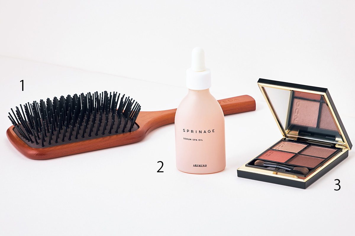 1「肌あたりが強すぎず、タッピングもできて血行促進に」パドルブラシ¥5,060(アヴェダ)2「洗顔直後やスキンケアの最後に使えば、乾燥するホテル滞在中も一日中しっとり。全身に使えるので地方公演には必ず持参します」スプリナージュ セラムスパオイル 40ml ¥4,180(アリミノ)3「透け感があって、目周りに自然な陰影を出せる絶妙なベージュ」SUQQU シグニチャー カラー アイズ 01 瑞花¥7,700(SUQQU)