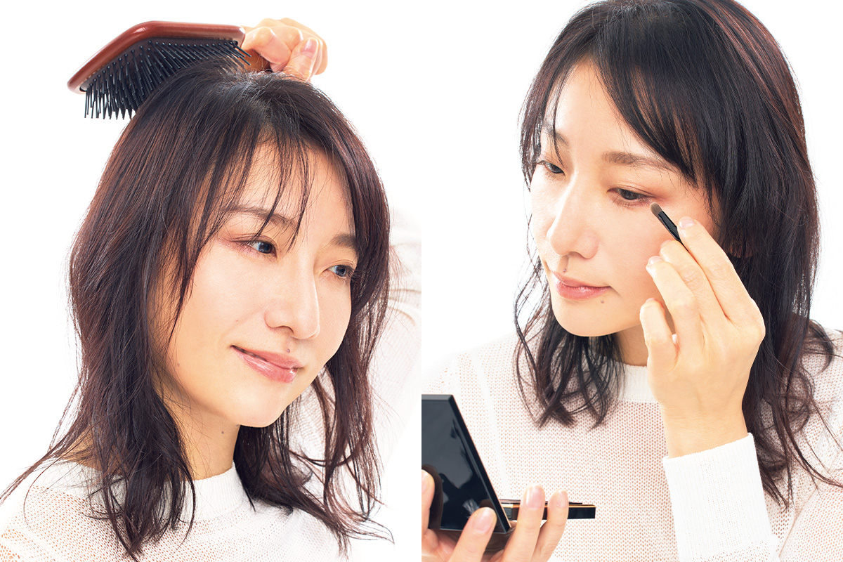 左/「毎朝頭皮と首の根元をポンポンと叩いてマッサージ。顔がシャキッと明るくなります」右/「ポイントは目周りの影感。ファンデで消えた目の際の影を入れ直すイメージでベージュアイシャドウを入れていきます」