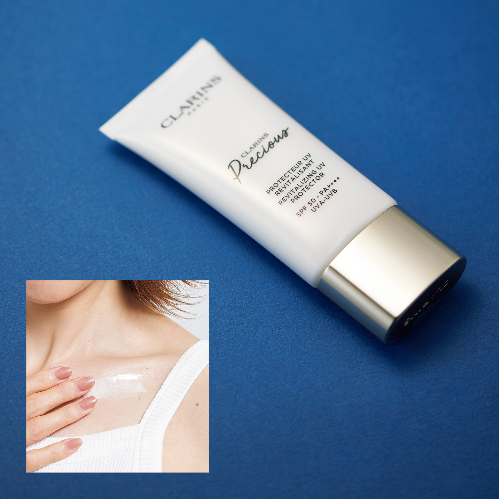 白い光を反射するマザー・オブ・パールを配合し、保護ヴェールを形成。顔だけではなく、デコルテにも塗れば、レフ板効果で顔色も明るく。ポリマーがチリやほこりからガード。SPF50・PA++++30ml ¥15,400(クラランス)