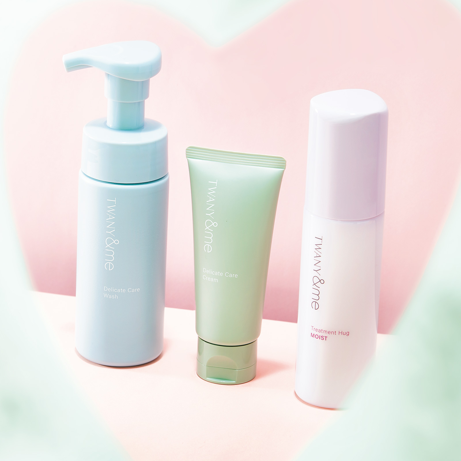 左から:繊細な部位に適した弾力のある濃密な泡を実現。やさしい感触でうるおいを守りながらしっかり洗浄。トワニー デリケートケアウォッシュ150ml¥2,750、うるおいを守りながら、気になる下着などの摩擦を抑えて、汚れの付着をブロック。赤みやかゆみなどのトラブルを回避。同デリケートケアクリーム60g ¥3,080、周期的に繰り返すニキビや肌荒れを防ぎ、1本でゆらがない肌を目指す薬用化粧液。テカリやベタつきが気になる肌にはフレッシュ、敏感に傾きがちな肌にはマイルド、乾燥が気になるならモイスト。全3種から選べます。同アンドミー トリートメントハグ モイスト[医薬部外品]120ml¥3,520