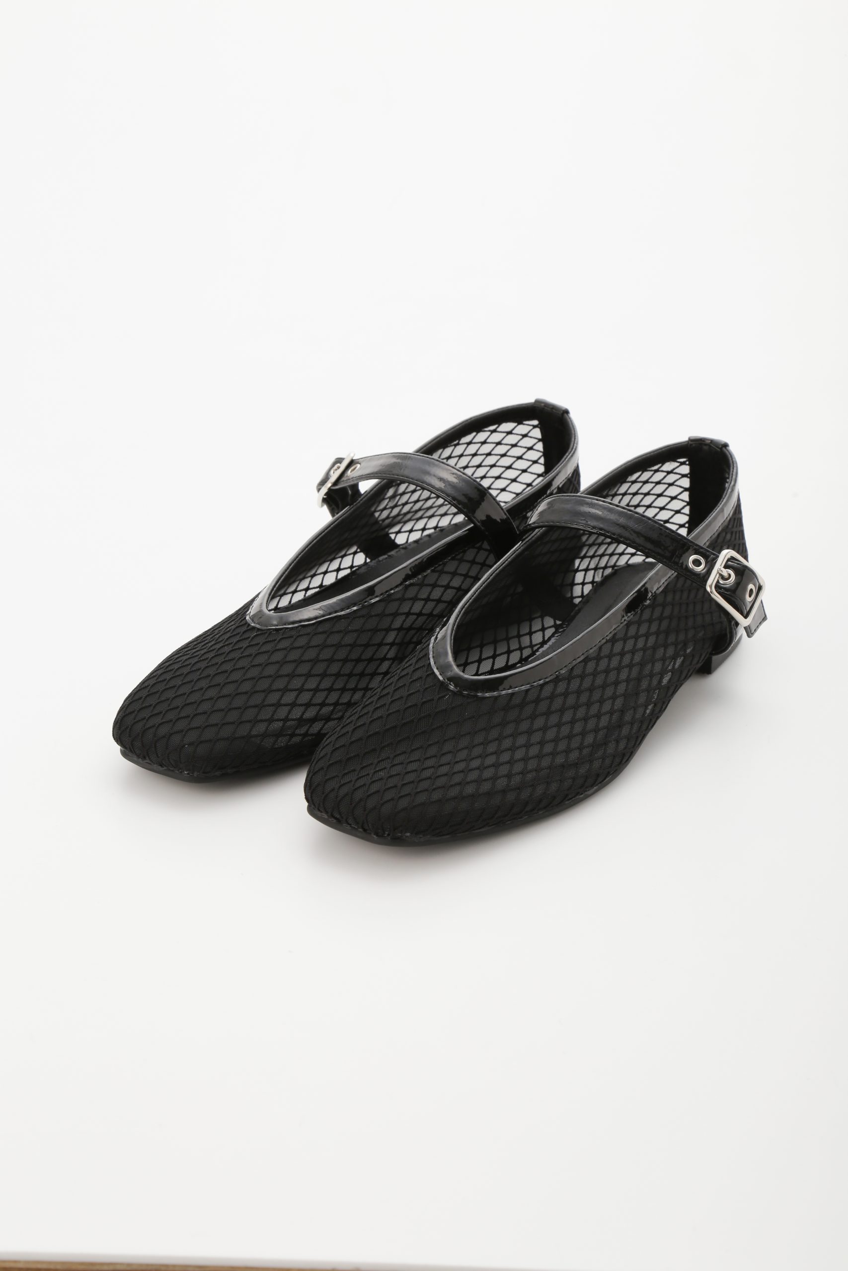 丸みのある優しげなスクエアトゥにVカットラインで、足をシャープに見せてくれる! 軽やかなメッシュ素材に、華奢なエナメルの縁取りのコントラストで引き締め効果も。シルバーのバックルが、フォーマルだけでなくカジュアルコーデにも◎。