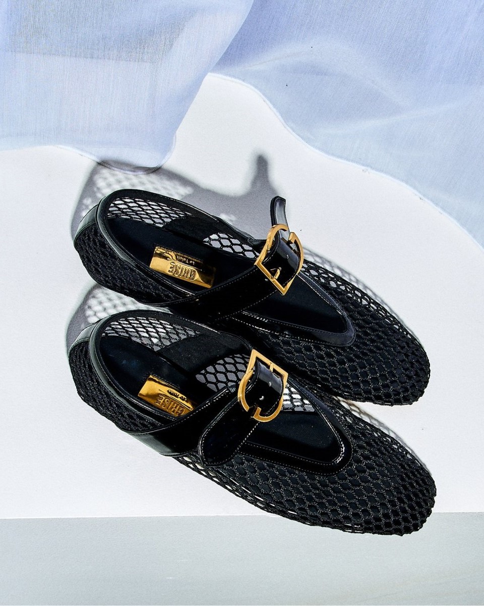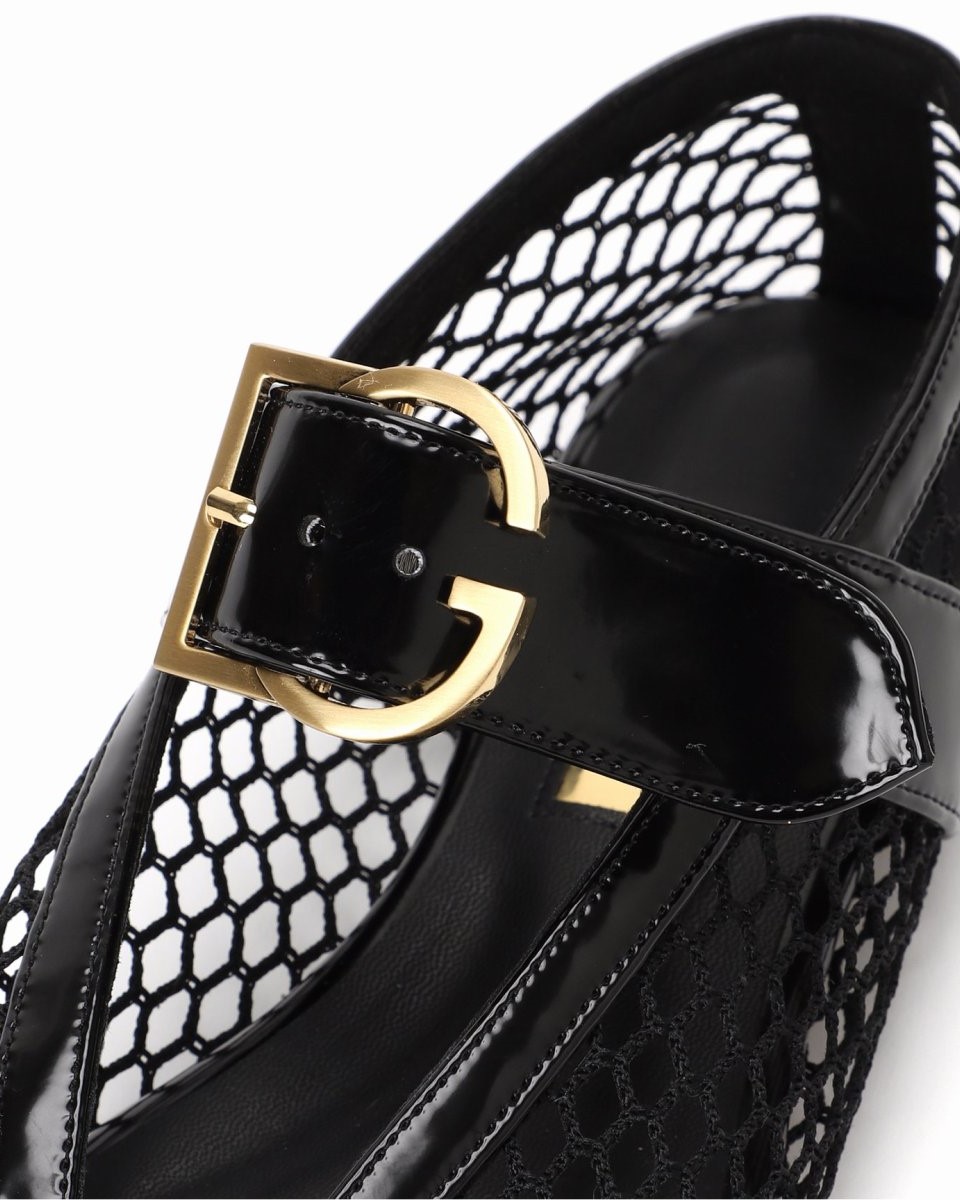 GRのロゴをモチーフにしたゴールドのバックルがアクセント。カジュアルなネットメッシュ素材ながら、エッジの効いたデザインでモードな印象に。透け感がありサンダル感覚で履けるところも使いやすい!