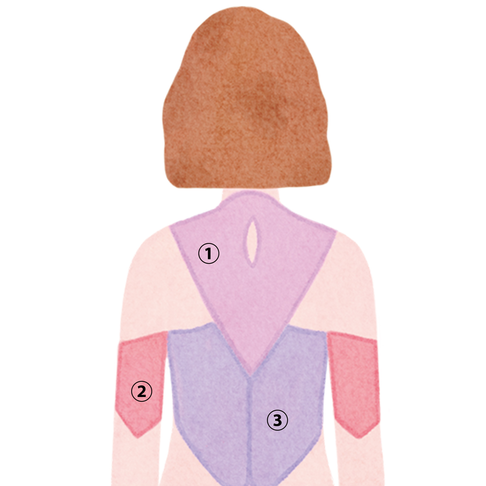 首から肩・背中をつないでいる表層の大きな筋肉。肩こりの原因になりやすい部位。ここが緊張して盛り上がると首が短く見える原因にも。