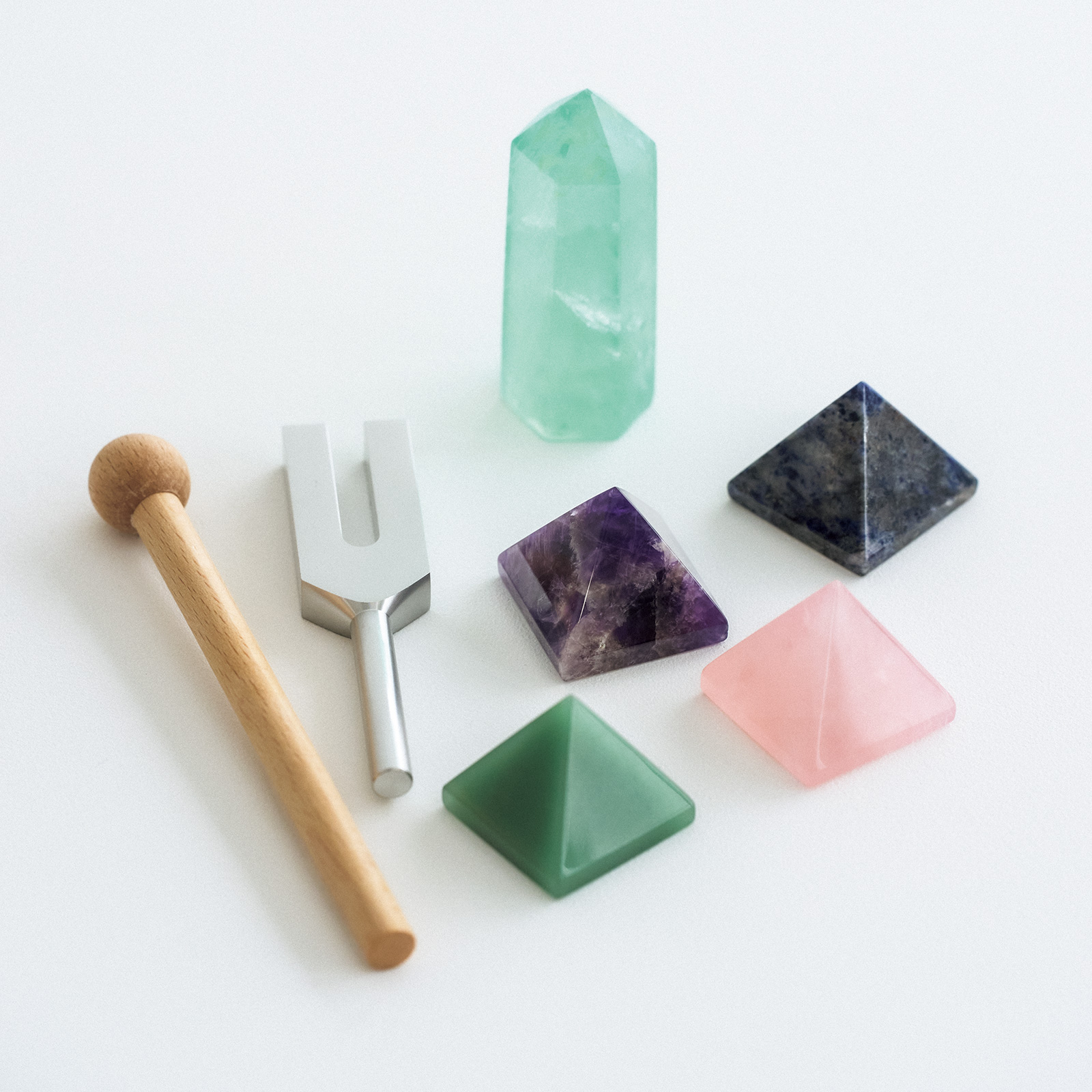 色が気に入って、Amazonで購入したパワーストーンと音叉。地方に行くときは必ず持参して、宿泊するホテルや楽屋の四隅に置いてその場の気を整えます。
