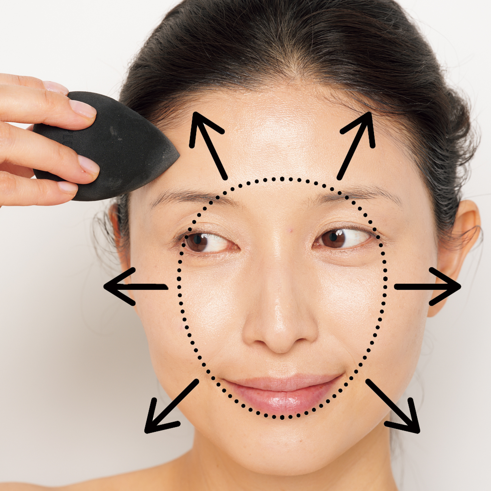 顔全体を明るくすると、顔が大きく見えがち。顔デカを防ぐには、顔の中心に明るいファンデをのせてから、外側に向かってスポンジでのばして。首の色と自然につながり、顔が立体的に見える効果も。