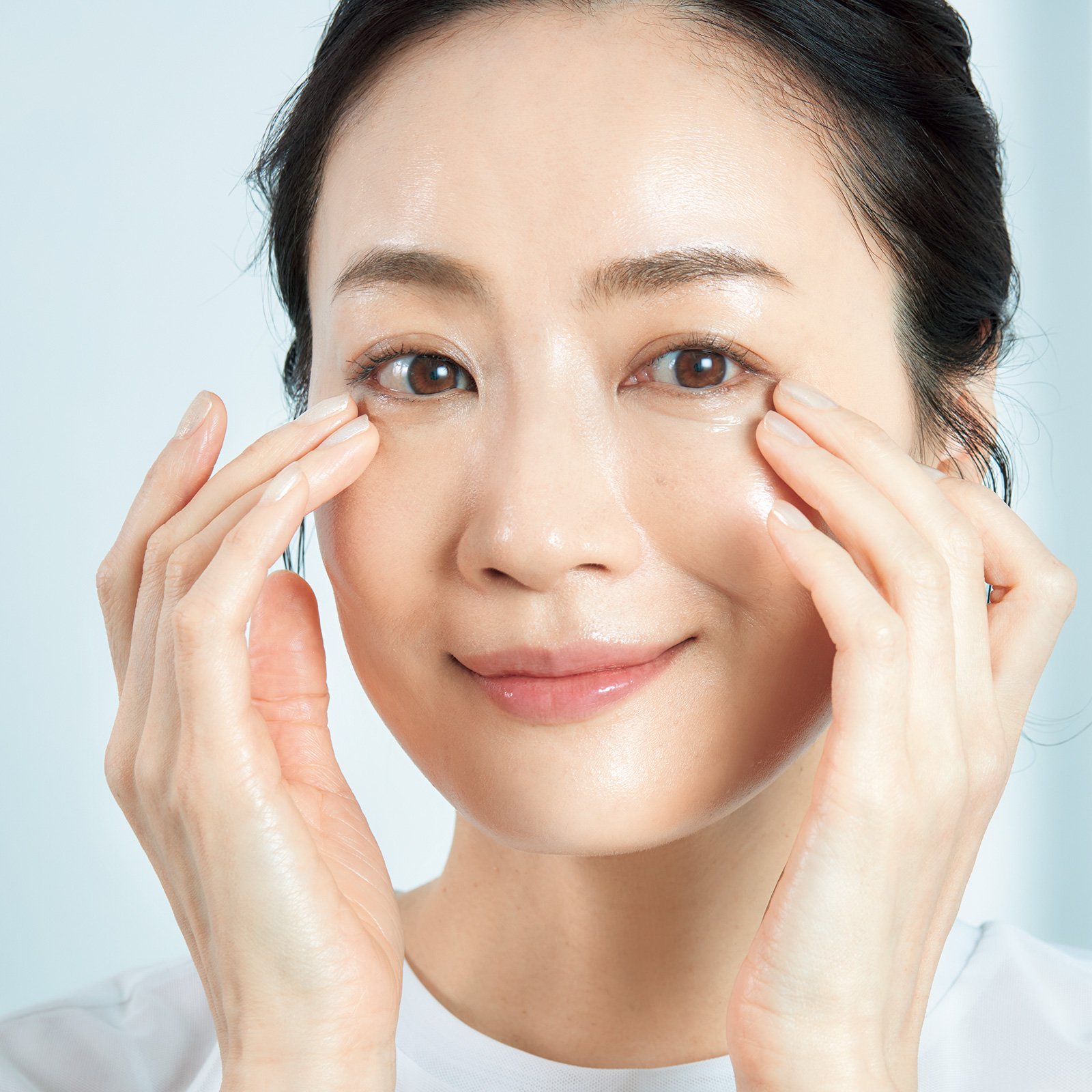 保湿系は目元や口周り、美白は頰、毛穴なら小鼻など、重点的にケアしたい箇所に先に塗布してから全顔に塗ると効き目アップ。塗り忘れの防止にも。