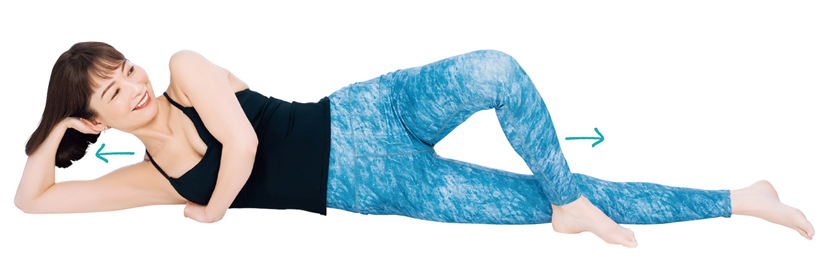 右手で頭を支えて、右わきを下にして床に横になります。左手をにぎりこぶしにして、右側のわきの下に当て、体重をかけます。左足の裏を床につけ、左足の力で体を上下にゆっくり小刻みに動かしながら、にぎりこぶしでわきを刺激して、わきの筋膜をほぐします。痛みがある場合はかける体重を加減して。左右で1分ずつほぐしましょう。