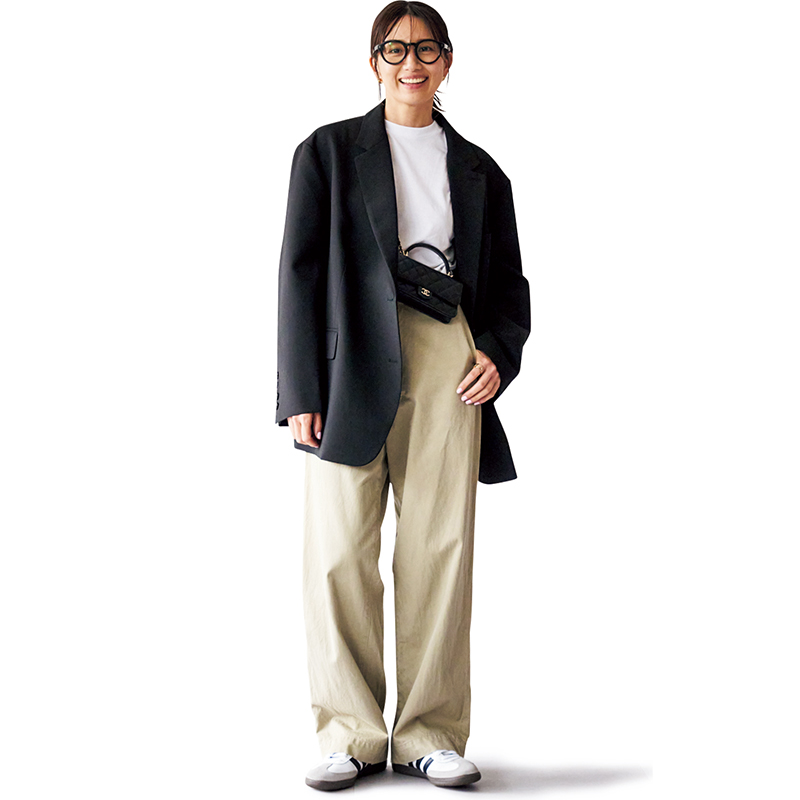 家族で伊勢のお参りに行くときの私服コーデ。オーバーサイズのジャケットできちんと感も出しつつ、ゆるパンツ、スニーカーで歩きやすさも追及。カジュアルなコーデもチェーンバッグ効果できちんとした印象に。