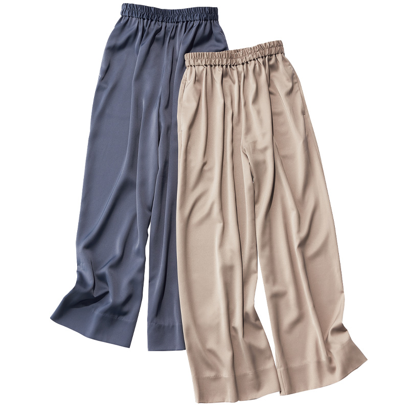 マットなサテン生地がデイリーに使いやすい。ウエストゴムで座りっぱなしもラク!サテンパンツ各¥19,800(ともにWRAY)