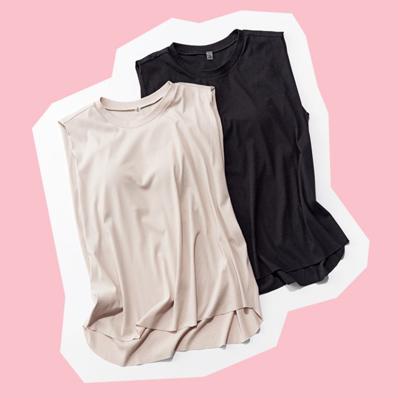 シンプルで女っぽく着られるボディウェアに定評あり。カップ付きノースリーブカットソー各¥11,000(ともにサク・レ/ロイネ)