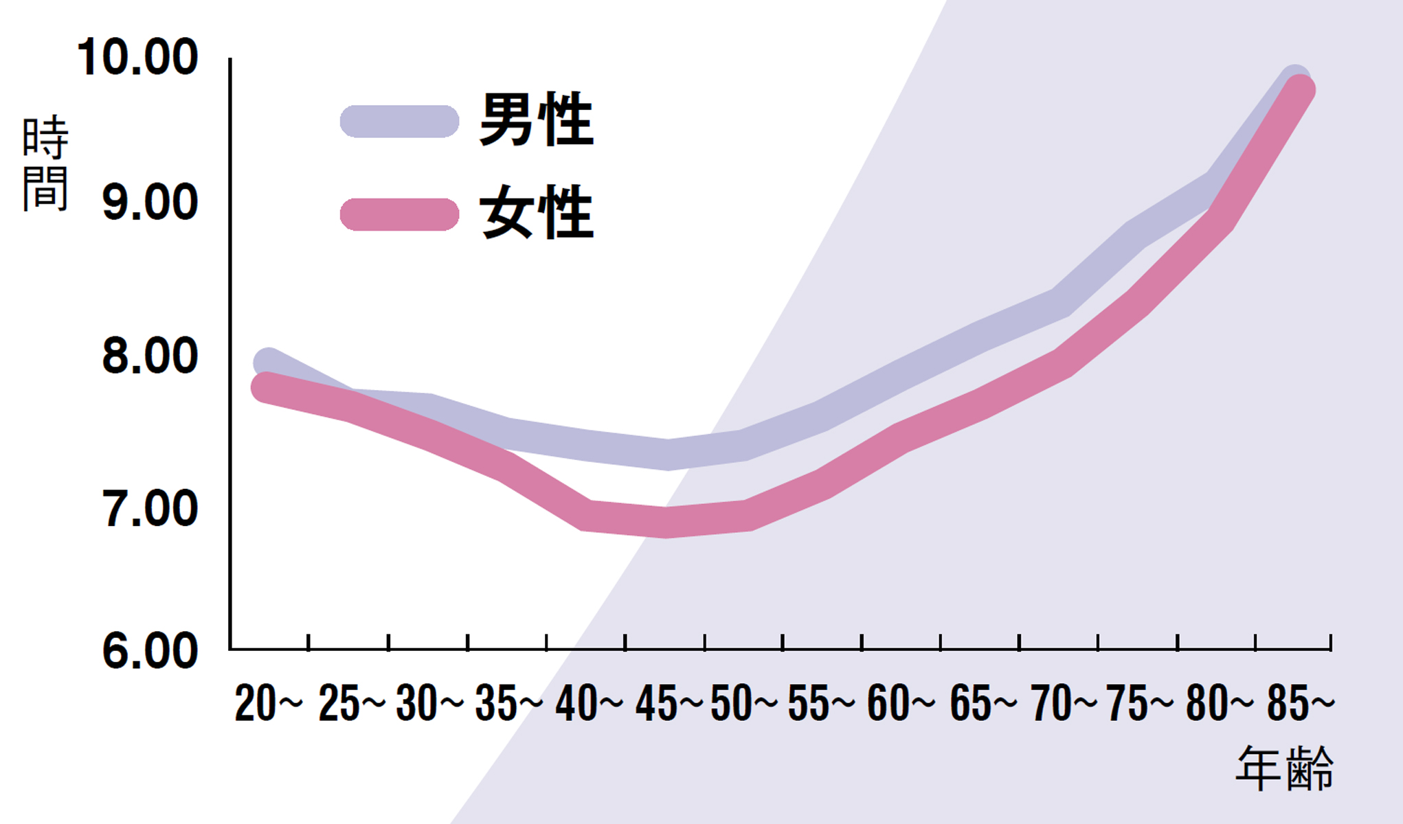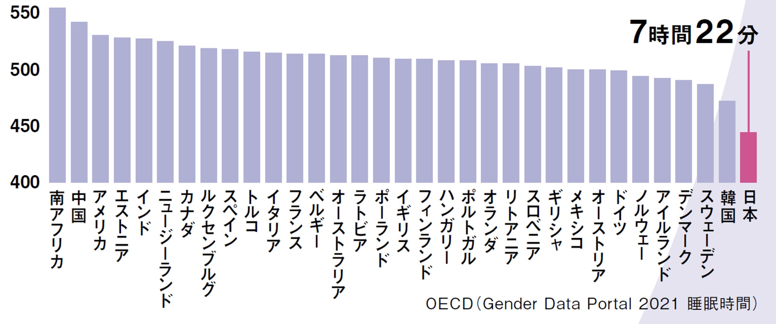 経済協力開発機構(OECD)の統計によればデータベースに含まれている世界33カ国で比較した結果、日本は最も睡眠時間の短い国であることがわかります。さらに男女差もあり、特に40代の女性が一番寝ていない結果に。