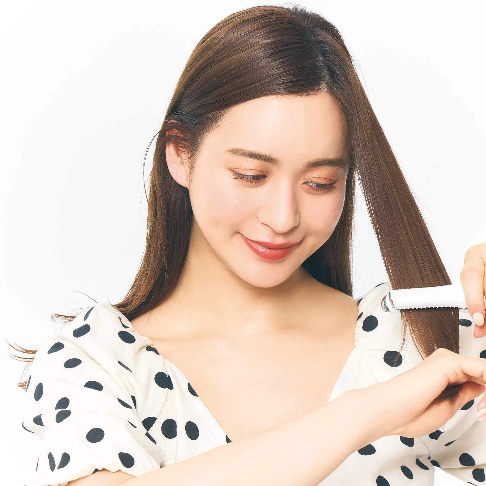 ストレートアイロンで全体の髪をストレートに伸ばします。毛先を軽く外ハネにすると今っぽい仕上がりに。顔周りや衿足など、湿気で広がりやすい部分は根元もしっかり伸ばして。