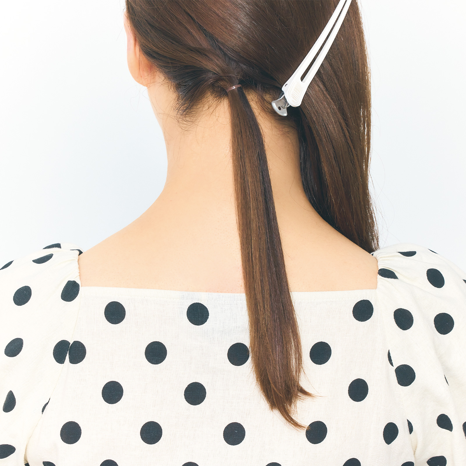 衿足の下辺から2cmくらいの髪を残し、それ以外の髪をダッカールで留めます。残しておいた衿足の髪をゴムで結んだらダッカールで留めていた髪をゴムを隠すように下ろし、すべての髪をサイドでまとめます。