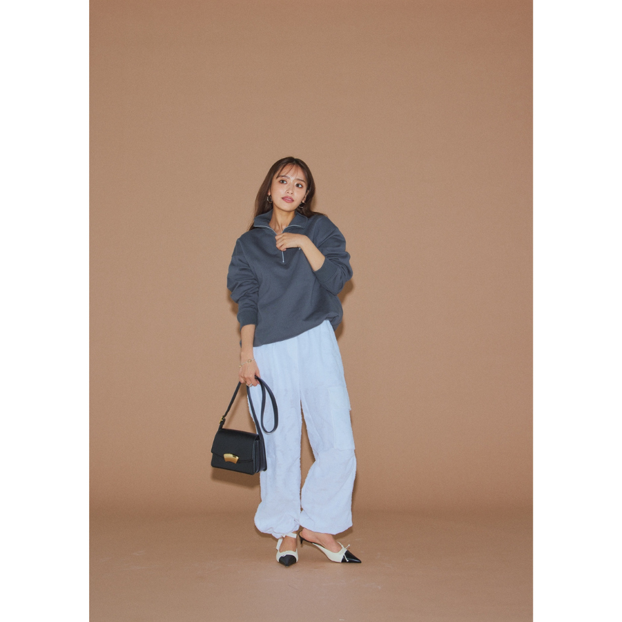 コンサバ度高めの園にも着られそうな白×ネイビーコーデ。スキッパータイプのプルオーバーは、定番のジップアップよりカジュアルさが抑えられて知的な印象に。裾がキュッとすぼまるトップスならウエストインしなくてもバランスよく着られます。トップスはスティーブン アラン、パンツはロンハーマン、バッグはへリュー、靴はピッピシックのもの。