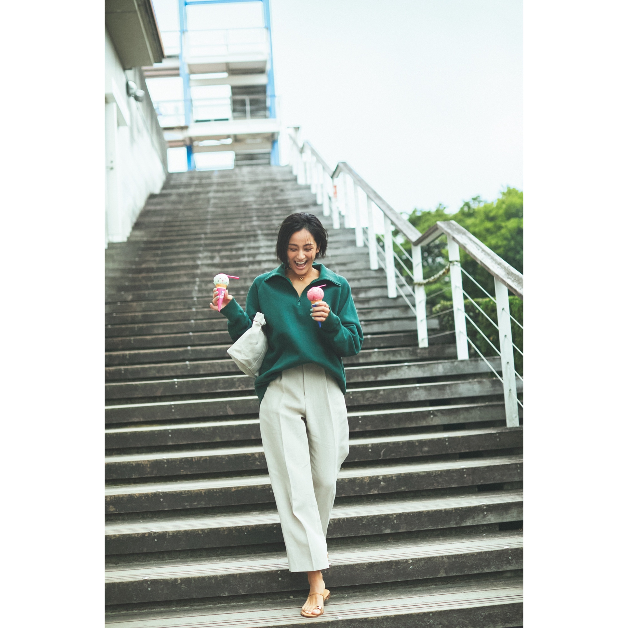 ジップアッププルオーバーは前を開けて程よく肌見せ&ネックレスなどの小物をプラスすると、カジュアルになりすぎず女っぽさを保てます。人とかぶりにくい明るめカラーも素敵です。トップスはエイトンステイプルズ、パンツはエイトン、バッグはソリッドアンドストロング バッグ ストア、サンダルはル タロンのもの。