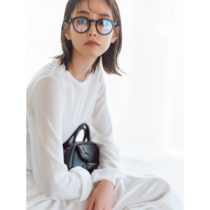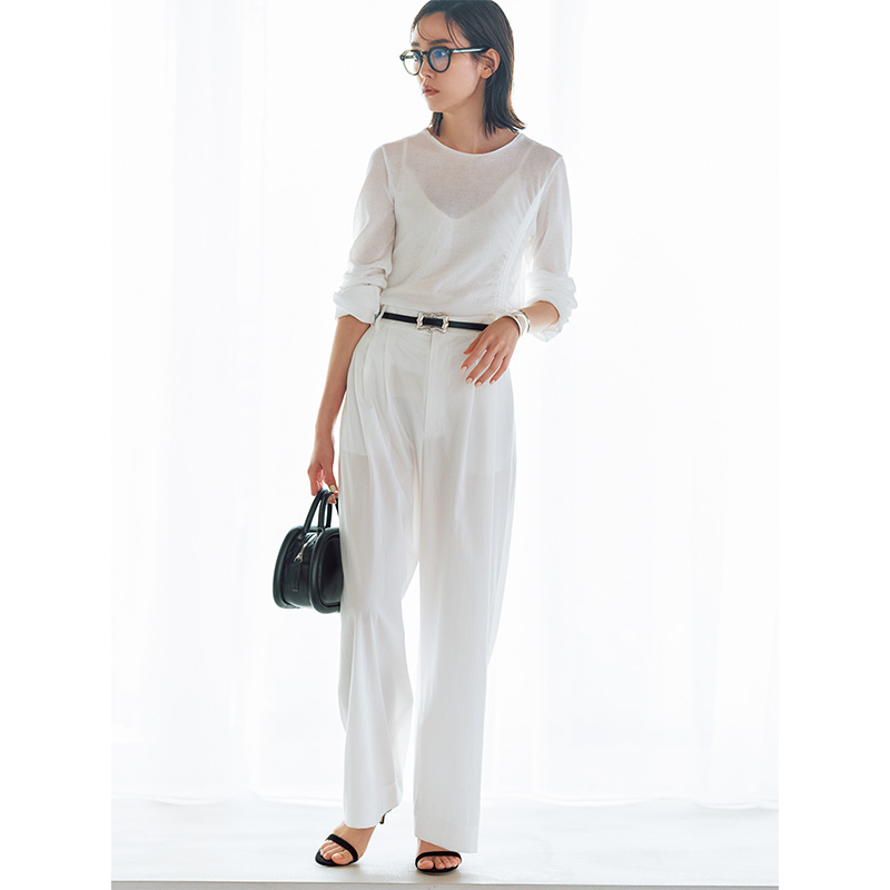 透け感のある長袖Tシャツはインナーも白で揃えて。黒小物も華奢なものを選んで、軽やかに仕上げて!パンツ¥20,900〈ユナイテッドアローズ〉ベルト¥24,200〈ア ヴァケーション〉サンダル¥68,200〈ネブローニ〉(すべてユナイテッドアローズ 六本木ヒルズ店)ロンT¥26,400(コラム/コラム伊勢丹新宿店)キャミソール¥9,900(ロンハーマン)バッグ¥189,000(ピエール アルディ/ピエールアルディ 東京)メガネ¥47,300(モスコット/モスコット トウキョウ)バングル¥333,300(SOPHIE BUHAI/エスケーパーズ アナザーワールド)
