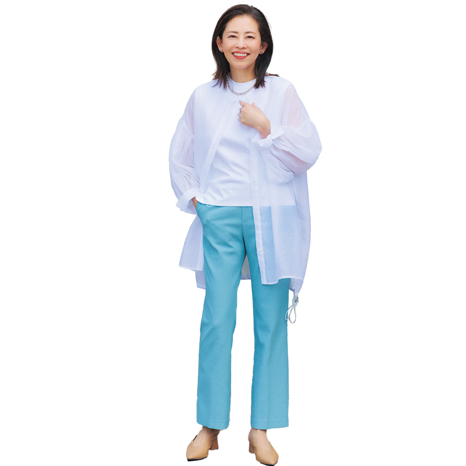 サイズが合うからといって若い子向けブランドの服を着ないこと。気になる腰回りや二の腕をシルエットやサイズ、丈感を見て調整するのが重要です。