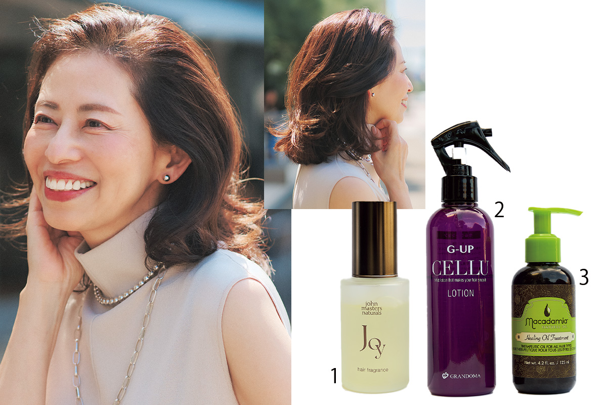 1.ジョンマスターオーガニックのヘアフレグランスJOYで髪の保湿を。2.タオルドイライの後にはG-UPのセルローションで頭皮ケア。3.髪をふんわり軽くするマカダミアナチュラルオイルのMNOオイルトリートメントNも愛用中。