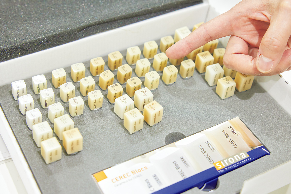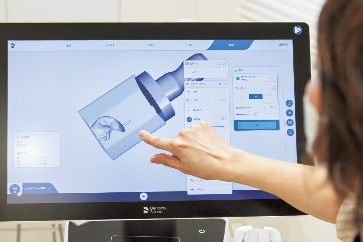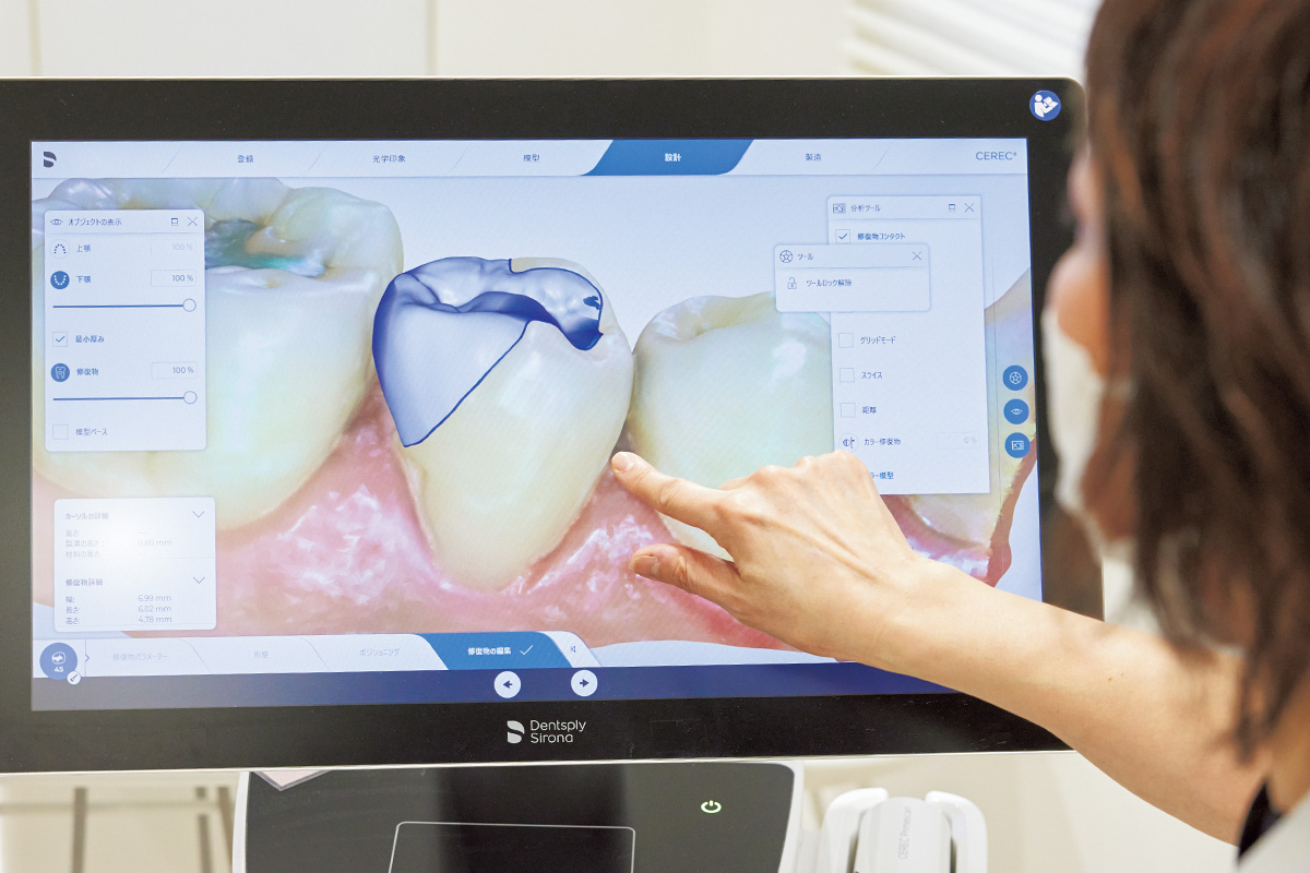 銀の詰め物をセラミックに変えたいが多忙の肥田さん。完了までに時間がかかる詰め物治療を迅速に行えるのがセレック。「セレックは口腔内をスキャナーで読み取るので従来の歯型取りは不要、詰め物が1日で完成するので迅速な治療が可能です。設計から製作までをコンピューターで進められるので従来よりも精巧な詰め物治療を時短でできる点が人気です」(田中先生)