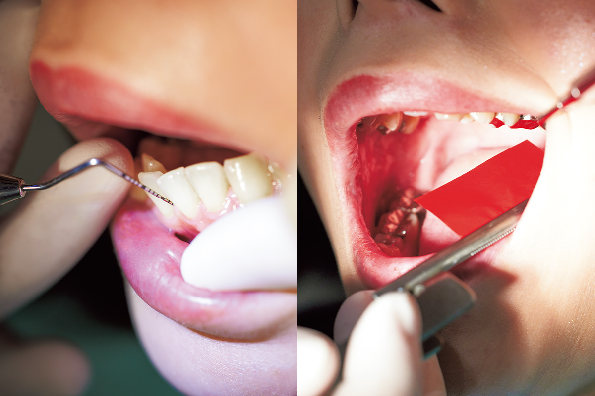 プローブで歯周ポケットの深さや歯肉の状態を検査。3mm以上が歯周病ですが肥田さんは奥歯に5mm程のポケットが。嚙み合わせの強い箇所は歯周病の進行が早いため咬合紙でチェック。「歯周病の治療は口腔内の菌を減らして炎症を取り除くことから。さらに歯石除去や歯磨き指導も必要です。歯周病は無自覚に進行しますから必ず定期的な検診を」(田中先生)