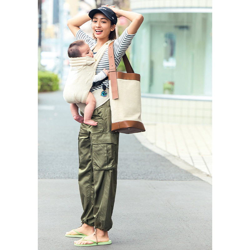 カットソー¥3,740(ロバート ピー.ミラー/GSI アブロス)パンツ¥25,300(マカフィー/トゥモローランド)キャップ¥3,850(アメリカン ニードル/スティーブン アラン シンジュク)バッグ¥21,450(アンドミューク/アマン)サンダル¥7,700(スリーパーズ/RHC ロンハーマン)抱っこ紐/本人私物